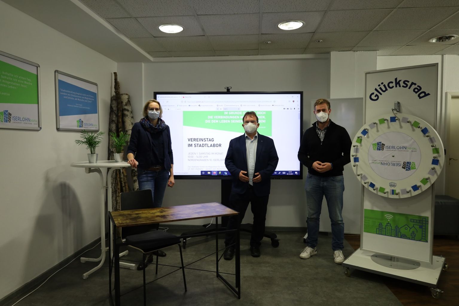 Christian Kißmer – Sportbüro –, Hinrich Riemann – Servicestelle Ehrenamt – und Dr. Dagmar Lehmann – Projektleitung Smart City laden alle Interessierten zu den Vereinstagen im Stadtlabor ein.