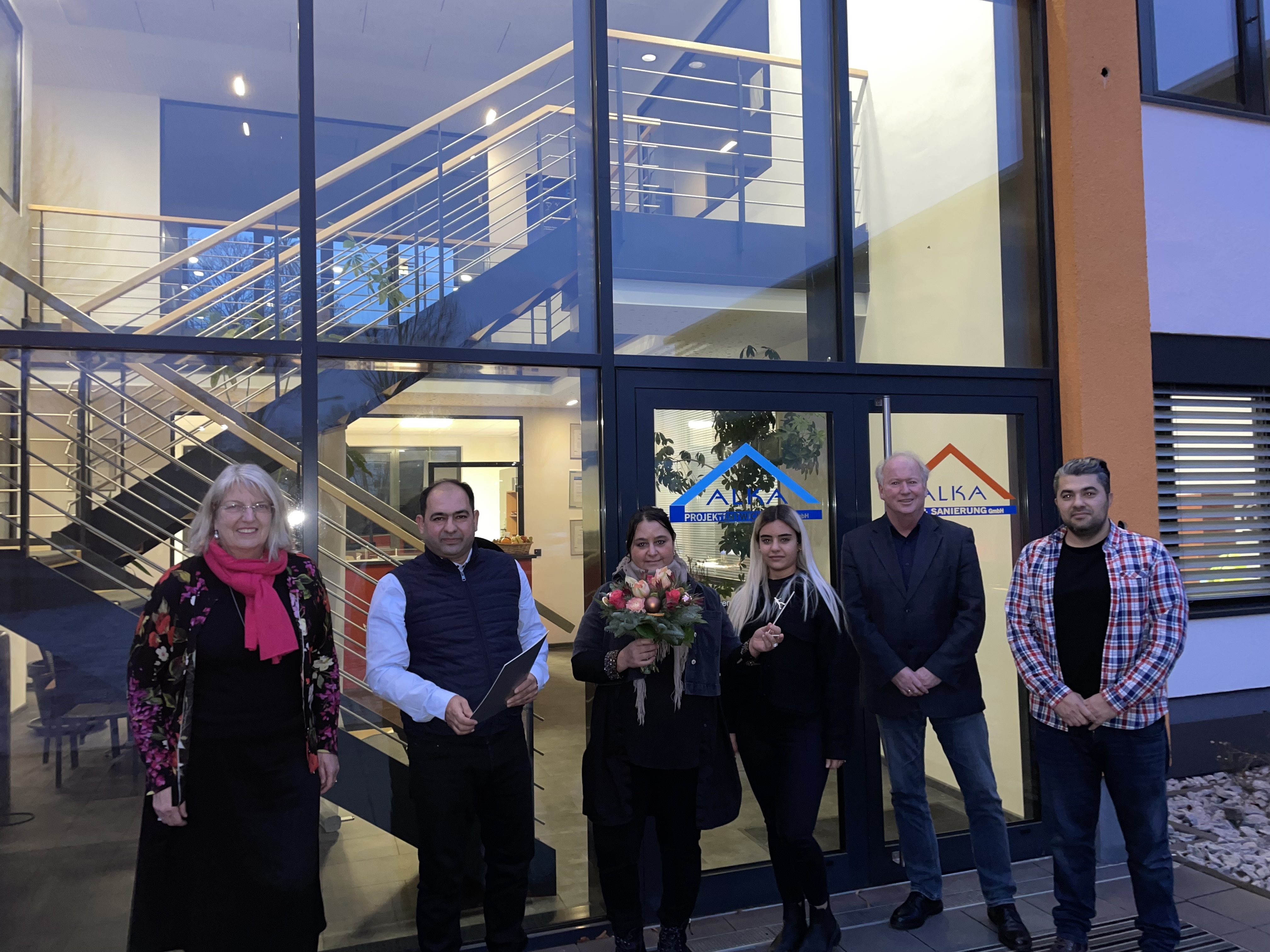 v. l. Bürgermeisterin Ilona Friedrich, Zuhal Albayrak und Tevfik Albayrakdem sowie weitere Mitarbeitende der Firma Alka Bau, Leiter der Kommunalen Arbeitsförderung Carsten Höhre