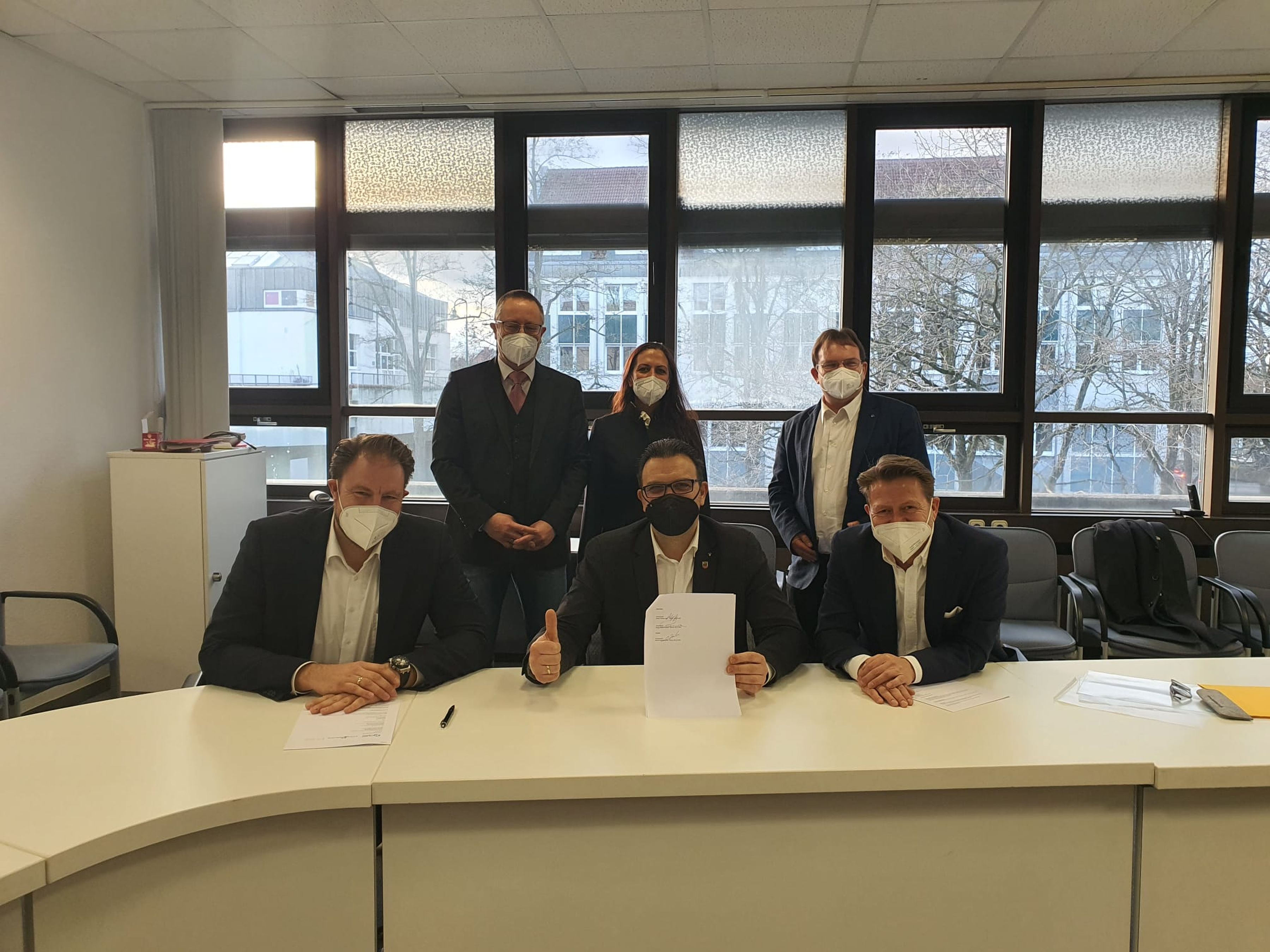 Philipp Jung von der Gräfe & Jung GmbH, Bürgermeister Michael Joithe und Stefan Franzen, Gründer von „I-Doo Multi Business Consulting“ (v.l.) unterzeichneten den Kooperationsvertrag für die 1. Ausbildungsmesse "Karriere Kick". Mit dabei (stehend v.l.): Thomas Haude (GfW) sowie Burcu Öcaldi (Leiterin des Bereiches Soziales) und Hinrich Riemann (Übergangsmanagement Schule-Beruf).