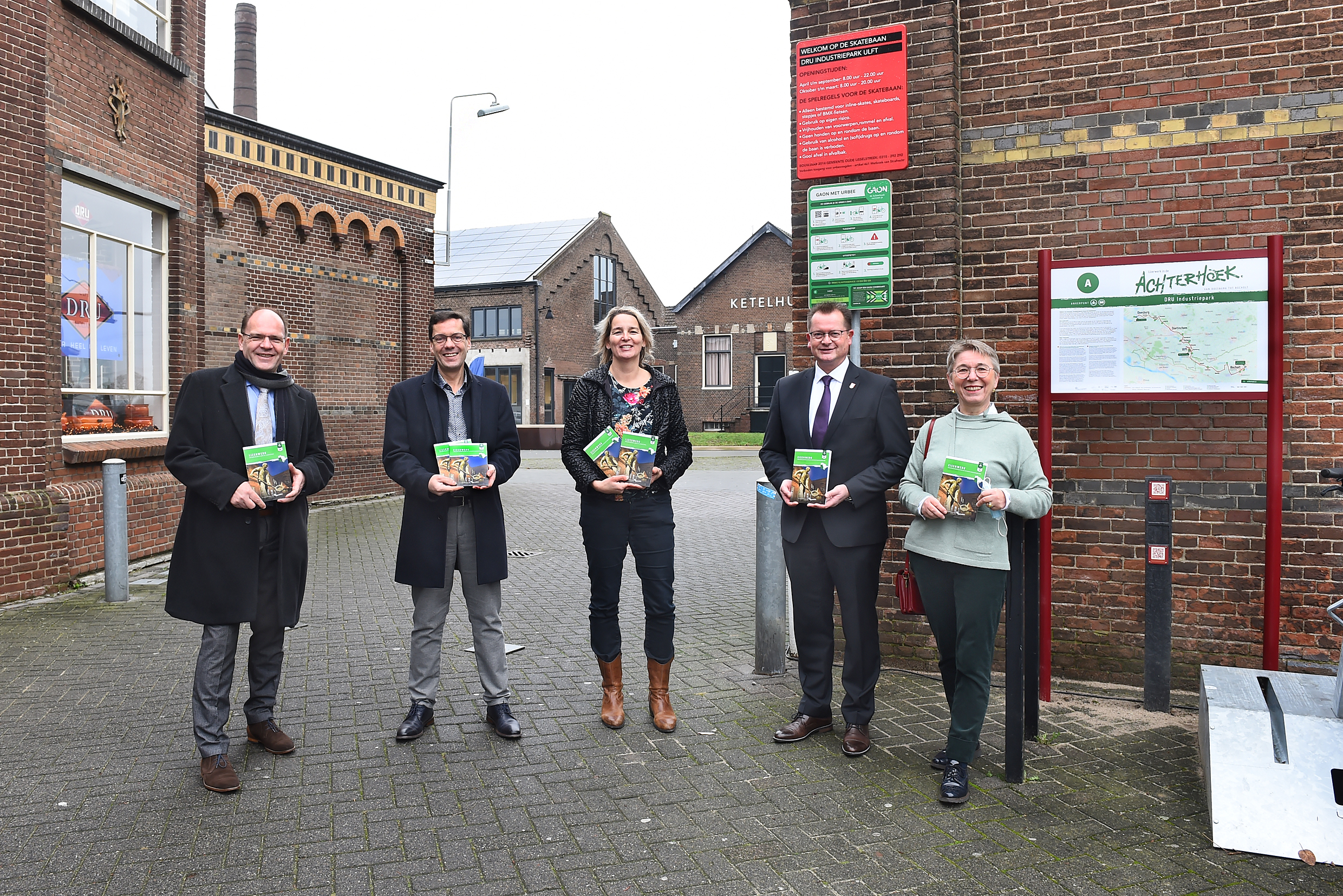 Die stellvertretende Bürgermeisterin Gudrun Koppers (1.v.r.) und der Bürgermeister der Stadt Isselburg, Michael Carbanje (2.v.r.), nahmen mit Vertreterinnen und Vertretern an der feierlichen Enthüllung der ERIH-Routentafel und der Skulptur „Eisengießer“ an der DRU in Ulft (Niederlande) am 13. Dezember 2021 an der DRU in Ulft (Niederlande) teil. (Foto: Stichting Achterhoek Tourisme, Roel Kleinpenning).