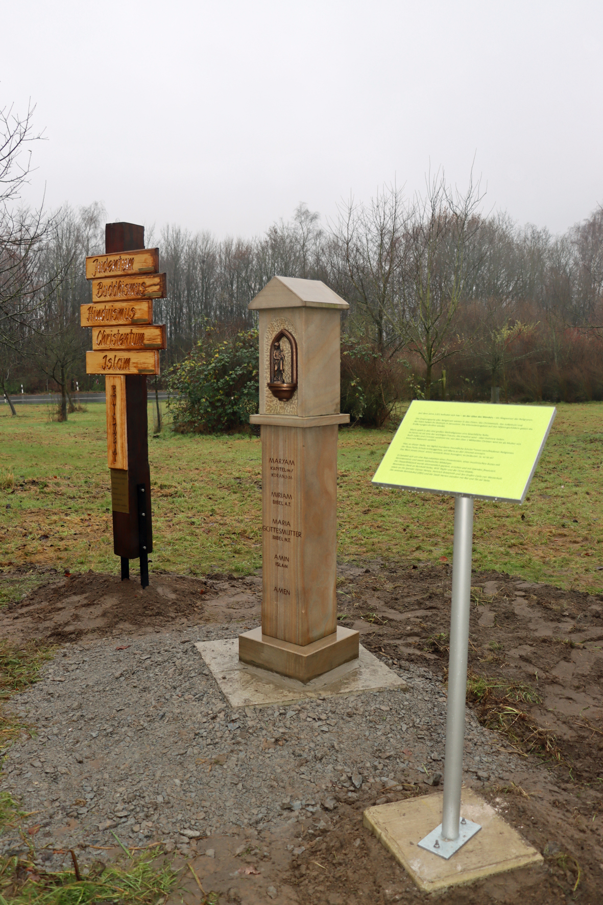 Pfarrer Bernhard Weskamp (2.v.l) weihte im Beisein von Bürgermeister Matthias Müller (3.v.l.) den von ihm erdachten Ort der Begegnung ein. Willi Töpfer, der den Bildstock herstellte (vorne, 2.v.r.) und Reinhold Keller, der den Bilderstock fertigte (vorne, rechts) waren ebenfalls anwesend.