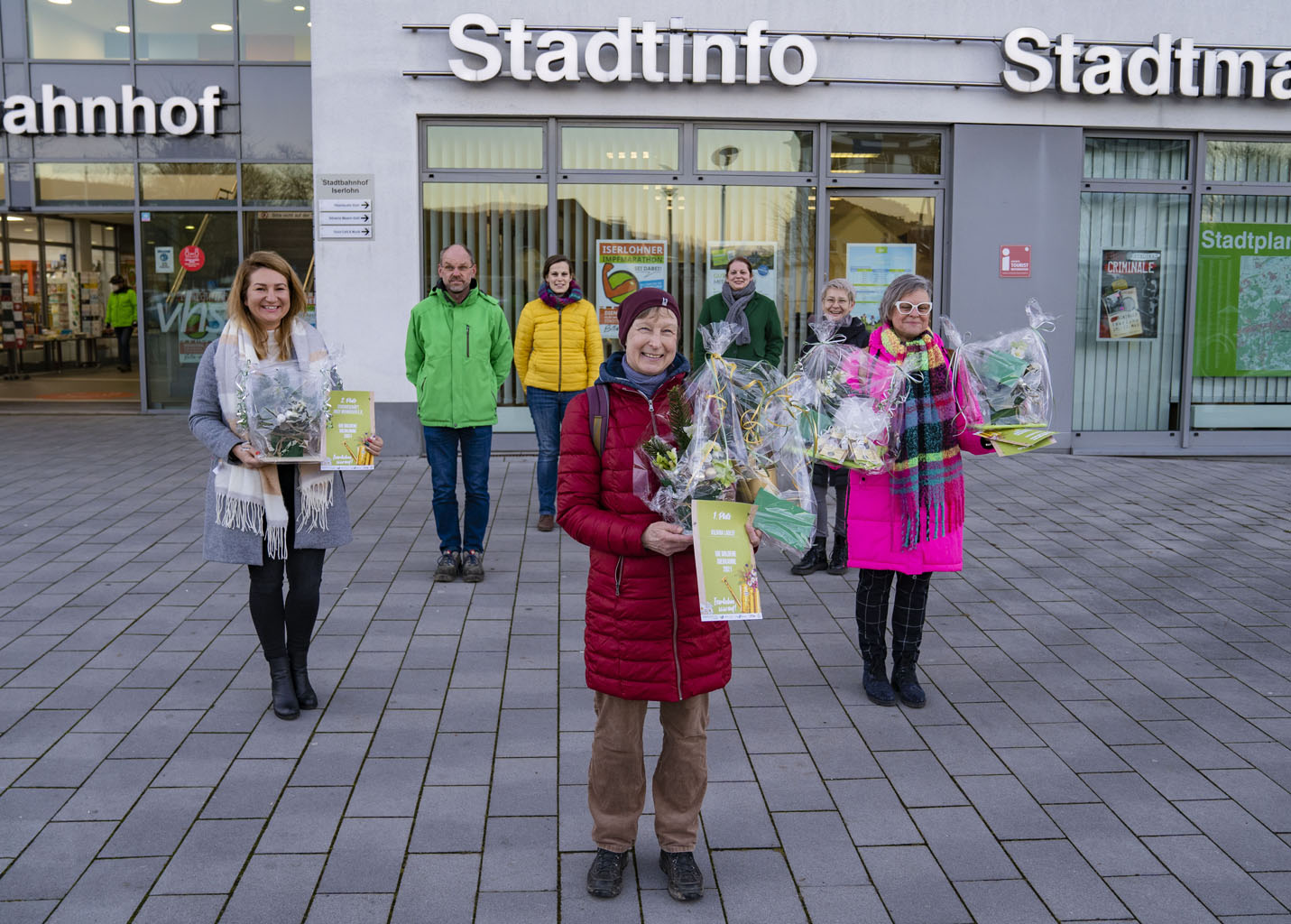 Siegerehrung beim Wettbewerb „Goldene Gießkanne 2021“ (v.l.): Jowita Kadzielawa (2. Platz), Eckehard Schröder (SIH), Simone Korte (Stadtmarketing), Kiliana Ladlef (1. Platz), Laura Niehus (Stadtmarketing), Ivonne Schönerstedt (Hagebaumarkt Holz & Bau), Petra Rößler (3. Platz und Sonderpreis "Summen & Brummen").