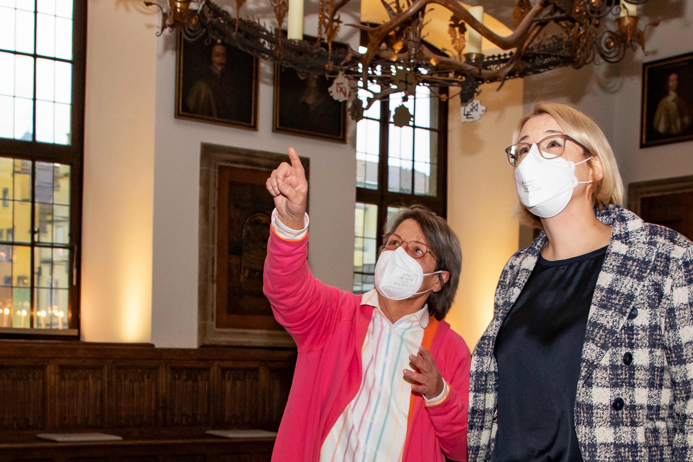 Hier kennt sie sich bestens aus und kann sogar Oberbürgermeisterin Katharina Pötter noch mit interessanten Hintergründen zu den Gesandten auf den Porträts überraschen: Renate Frankenberg (links) im Friedenssaal des historischen Rathauses.