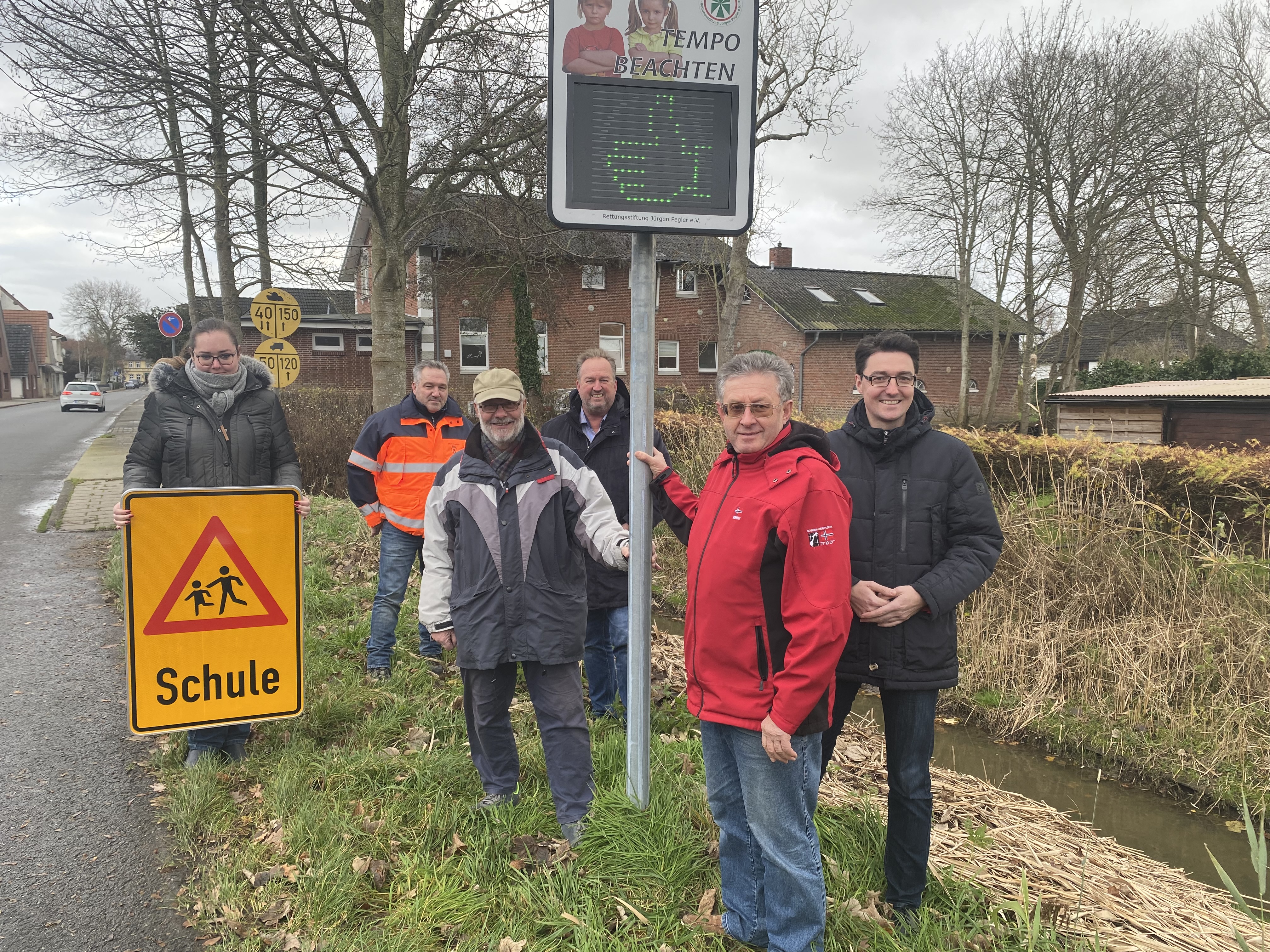 Richard Heinisch (vorne) und die Rettungsstiftung Jürgen Pegler übergaben an Ortsbürgermeister Christoph Frauenpreiß (rechts), den ehemaligen Ortsbürgermeister Hans-Jürgen Umland (3.v.l), Katharina Stegemann (links), Andreas Bullwinkel (2.v.l.) (beide Stadtverwaltung) und Oberbürgermeister Uwe Santjer (4.v.l.) das Display und insgesamt sechs Warnschilder. Foto: Stadt Cuxhaven