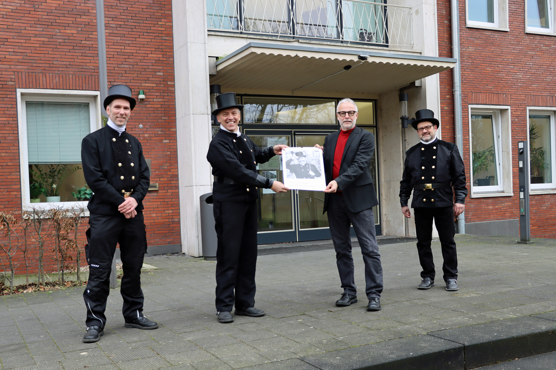Traditionell zu Jahresbeginn empfing Bürgermeister Matthias Müller (2. v. rechts) die Schornsteinfeger im Hertener Rathaus. (v.l.n.r.) Kalle Hessefort, Martin Dodot und Volker Giehl überreichten ihm einen Schornsteinfeger-Wandkalender und wünschten für das neue Jahr alles Gute.