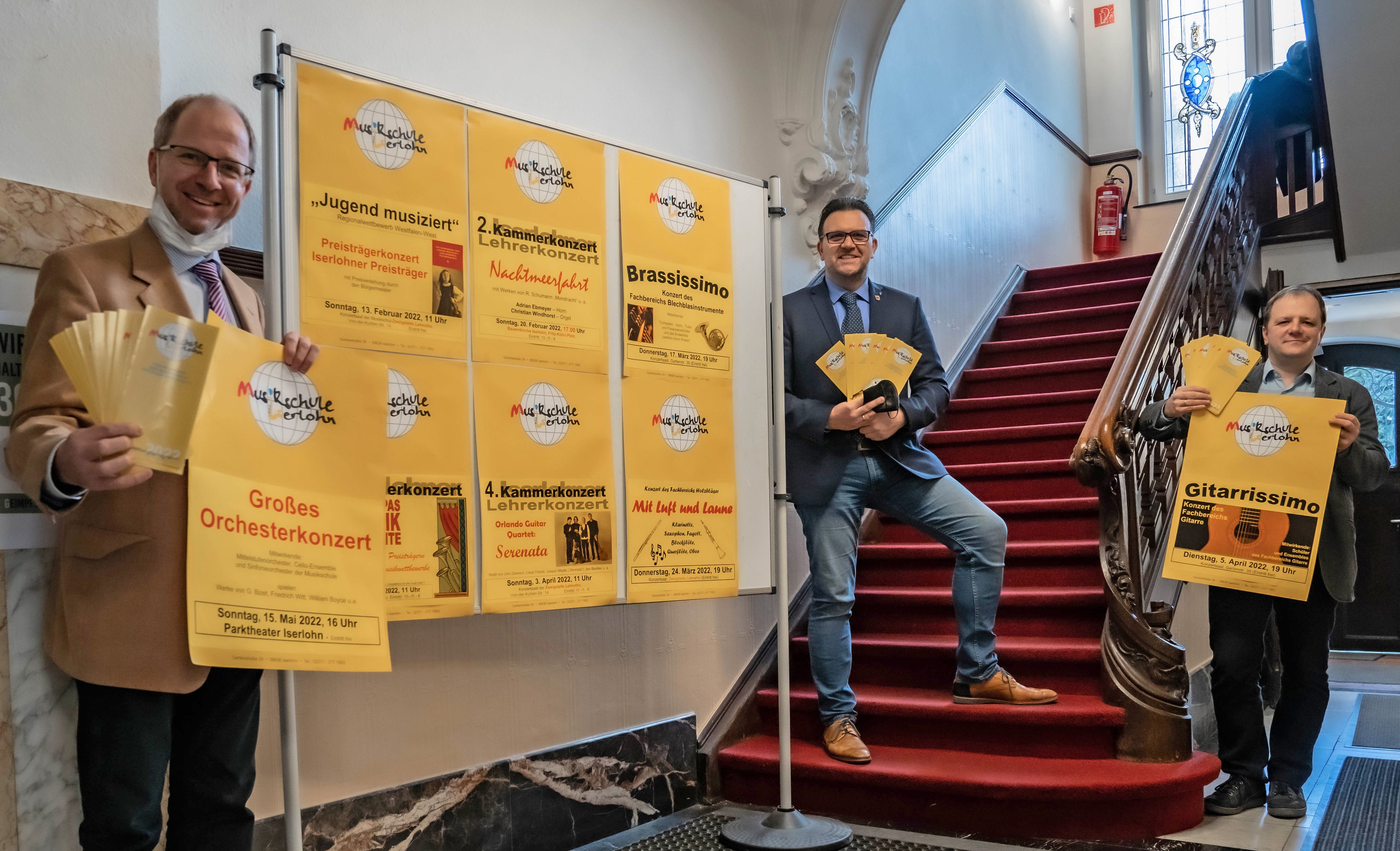 Musikschulleiter Paul Breidenstein, Bürgermeister Michael Joithe und der stellvertretende Musikschulleiter Adrian Ebmeyer (v.l.n.r.) stellen das Veranstaltungsprogramm 2022 der Musikschule vor.