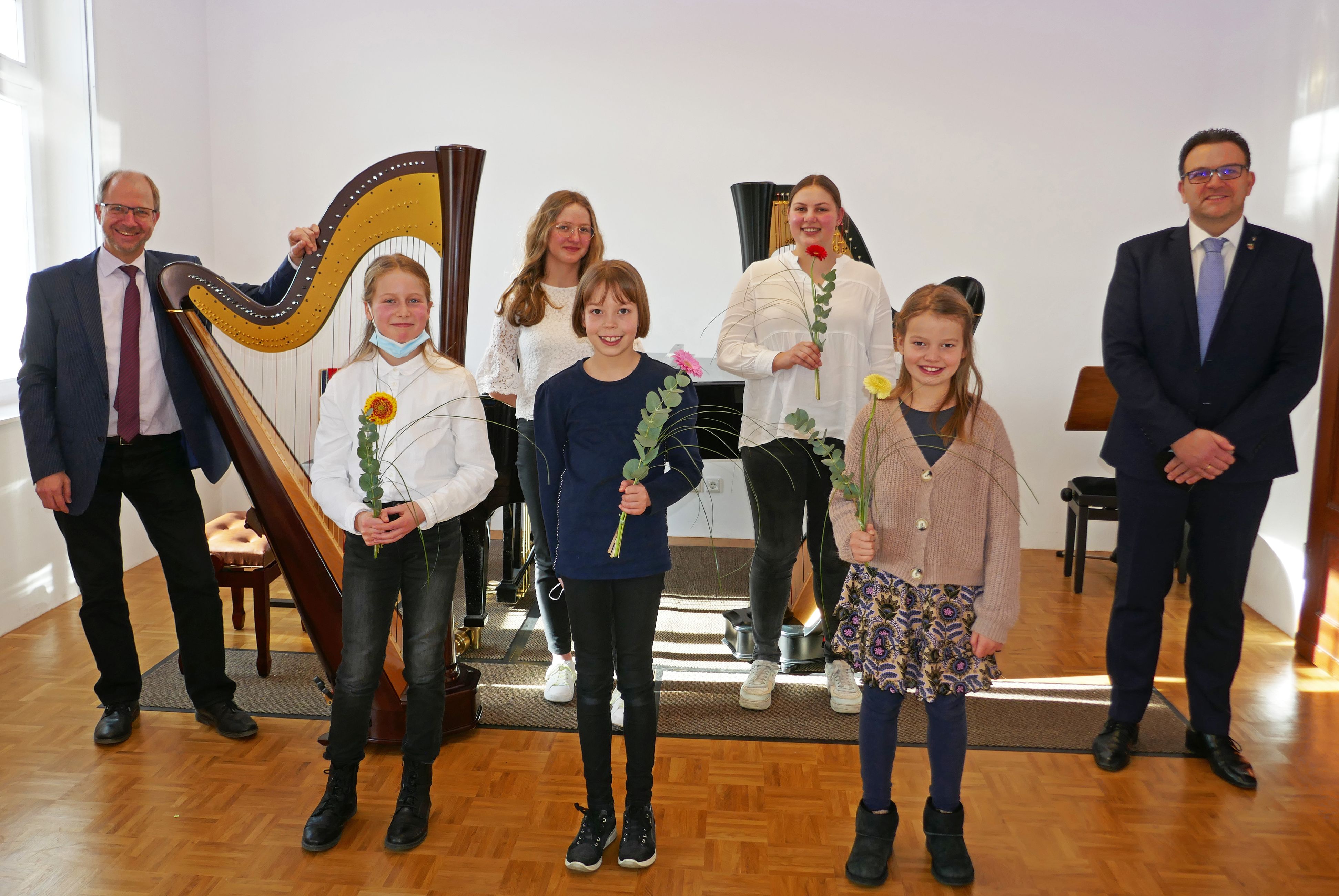 Die Iserlohner Teilnehmerinnen mit Bürgermeister Michael Joithe (re.) und Musikschulleiter Paul Breidenstein.