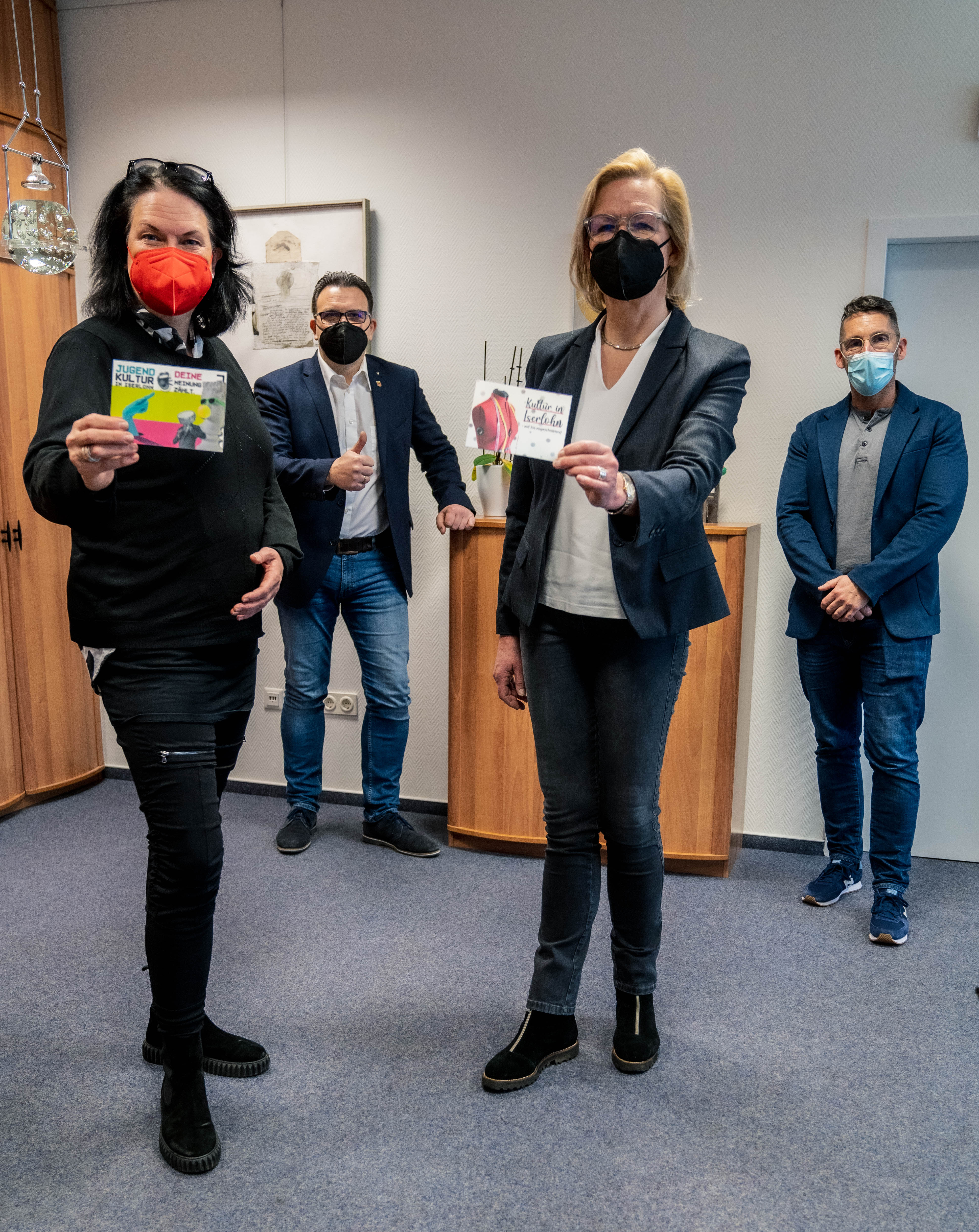 Ab heute ist die Online-Umfrage für alle Bürgerinnen und Bürger geschaltet. Auf das Ergebnis freuen sich v.l.: Anja Ihme (stv. Vorsitzende des Kulturausschusses), Bürgermeister Michael Joithe, Eva Kirchhoff (Vors. des Kulturausschusses) und Matthias Quaschnik (Leiter Kulturreferat)