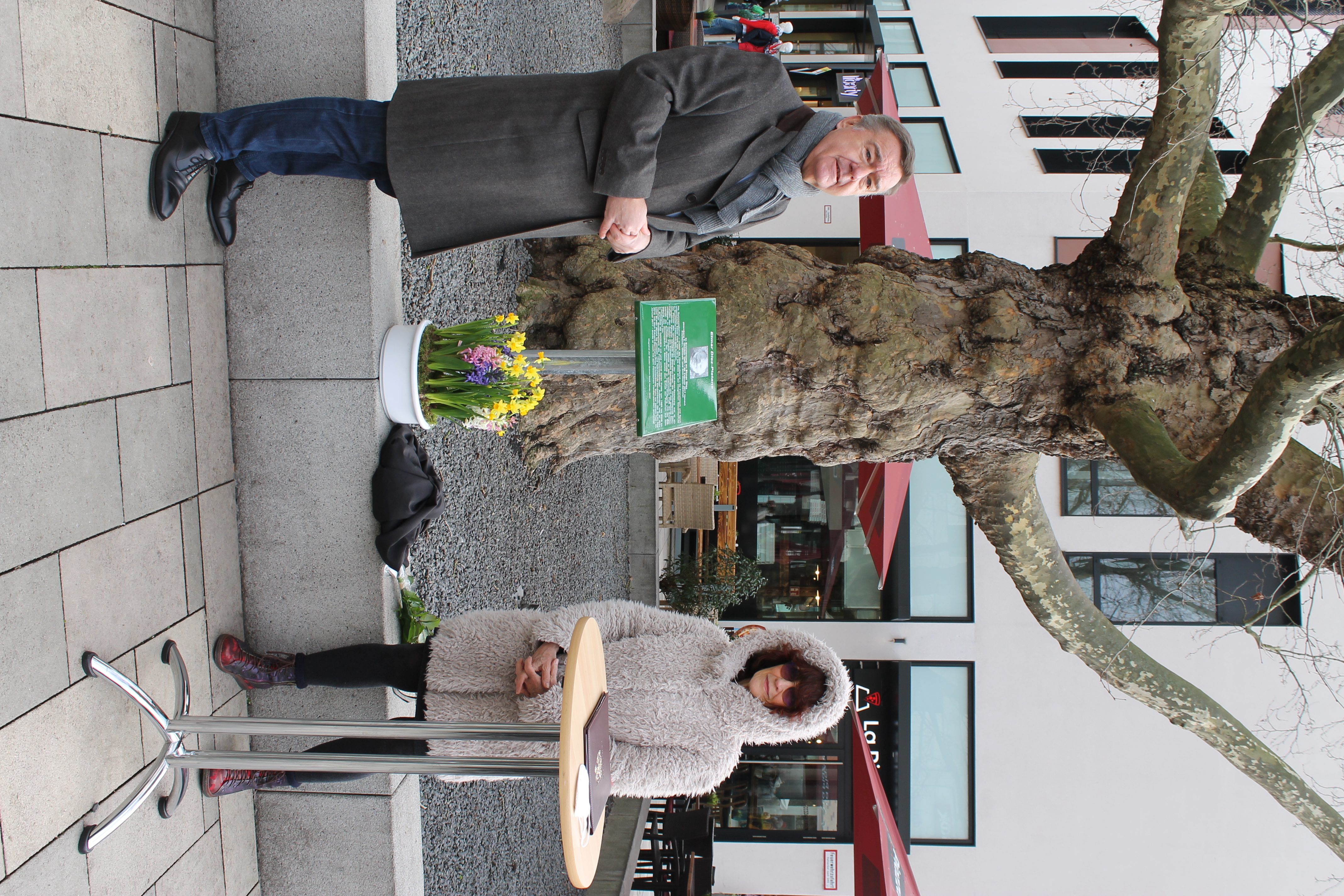 Gudrun Diez und Oberbürgermeister Claus Kaminsky enthüllten die Gedenktafel für die Elmar-Diez-Platane