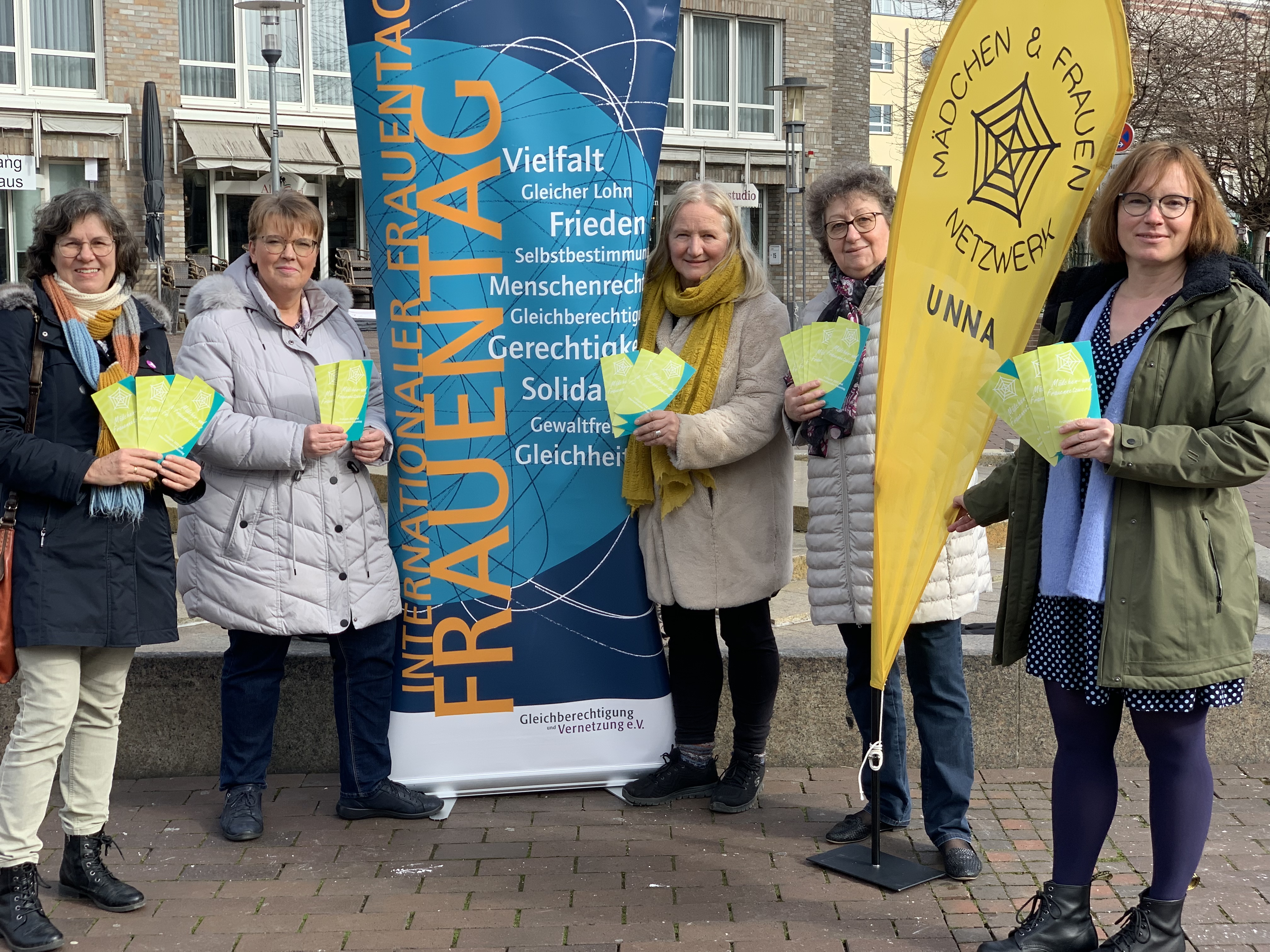 Auf dem Foto von links nach rechts: Dörte Humbert-Schneider (Frauenberatungsstelle), Katja Sahmel (Gleichstellungsbeauftragte Kreisstadt Unna), Petra Freitag (IN VIA Unna e.V.), Edith Weerd (Zonta-Club Hamm/Unna), Kerstin Kettrup (FamilienForum Katharina/CKU)