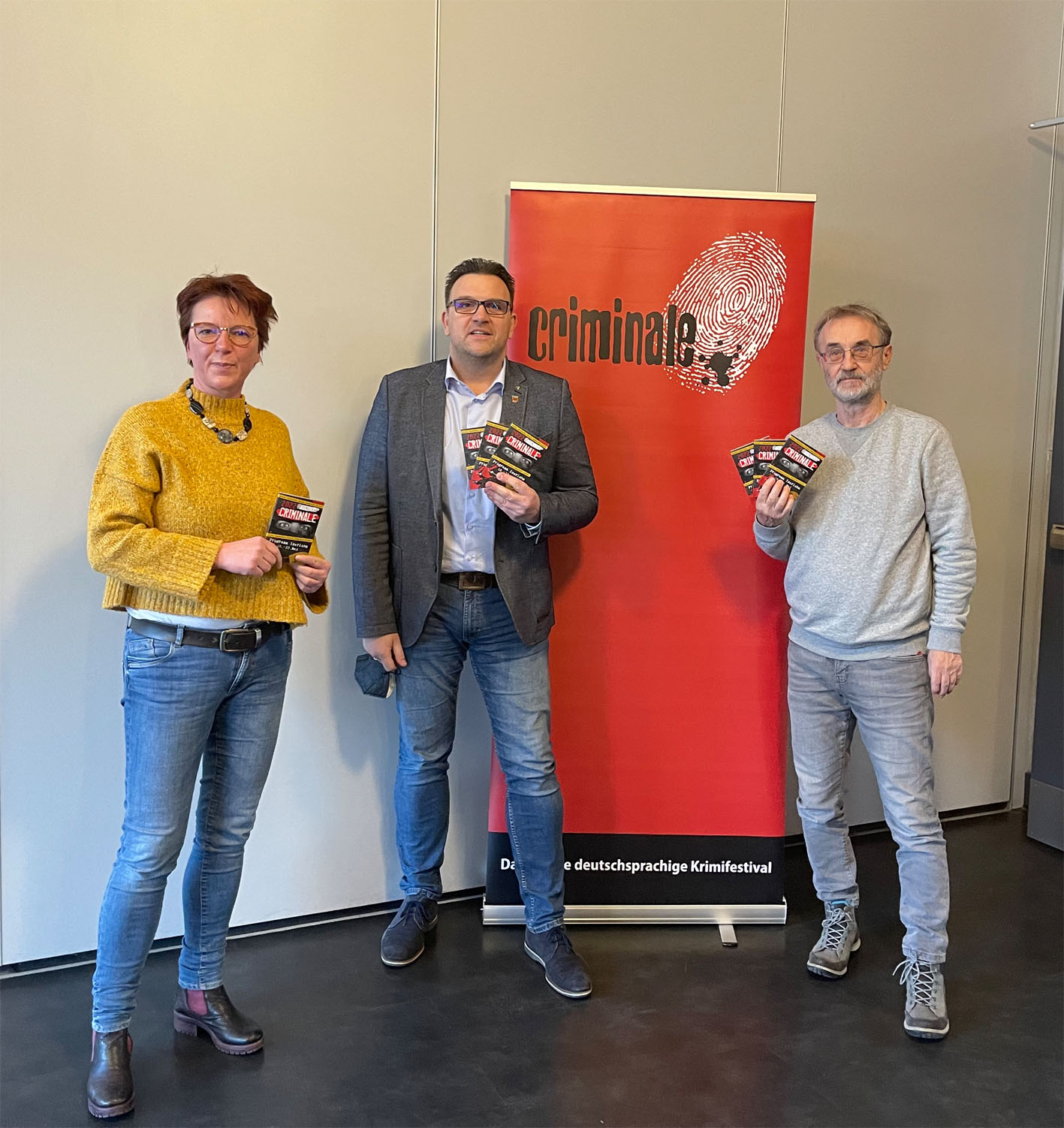 Bürgermeister Michael Joithe (M.), Glauser-Preis-Nominierte Kathrin Heinrichs und Autor und Kulturausschussmitglied Dr. Walter Wehner stellen das Programmbüchlein zur CRIMINALE 2022 vor.