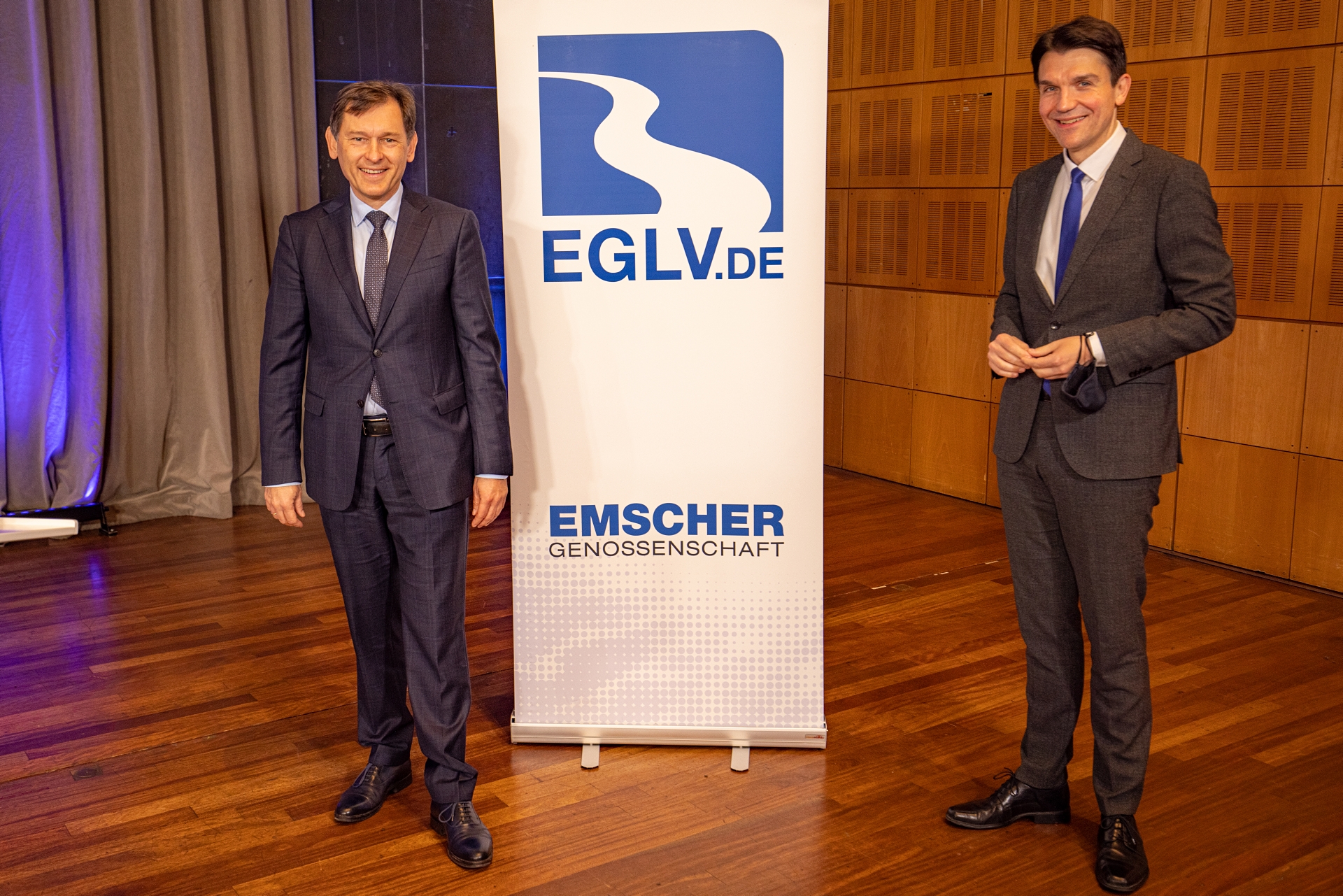 Als ersten Gast im neuen Podcast „Redefluss“ begrüßte der Vorstandsvorsitzende von Emschergenossenschaft und Lippeverband, Prof. Dr. Uli Paetzel (rechts im Bild) den Vorsitzenden des Genossenschaftsrates der Emschergenossenschaft, Dr. Frank Dudda (links im Bild).