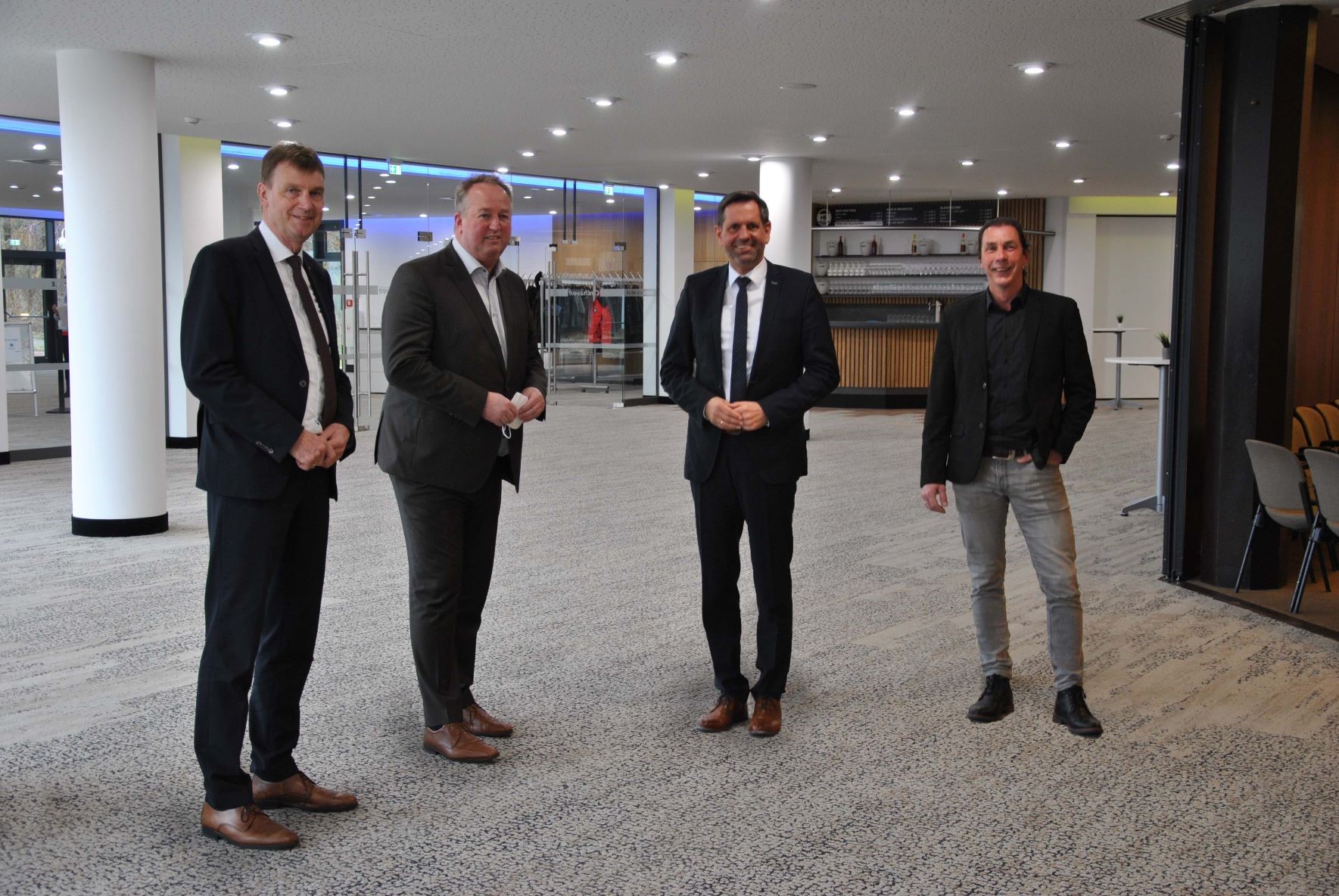 Umweltminister Olaf Lies (2.v.r.) überbrachte am Donnerstagmorgen an Landrat Kai-Uwe Bielefeld (links), Cuxhavens Oberbürgermeister Uwe Santjer (2.v.l.) und Land Hadelns Samtgemeindebürgermeister Frank Thielebeule (rechts) die Ergebnisse aus den Verhandlungen zur geplanten Verklappung vor Scharhörn. Foto: Landkreis Cuxhaven
