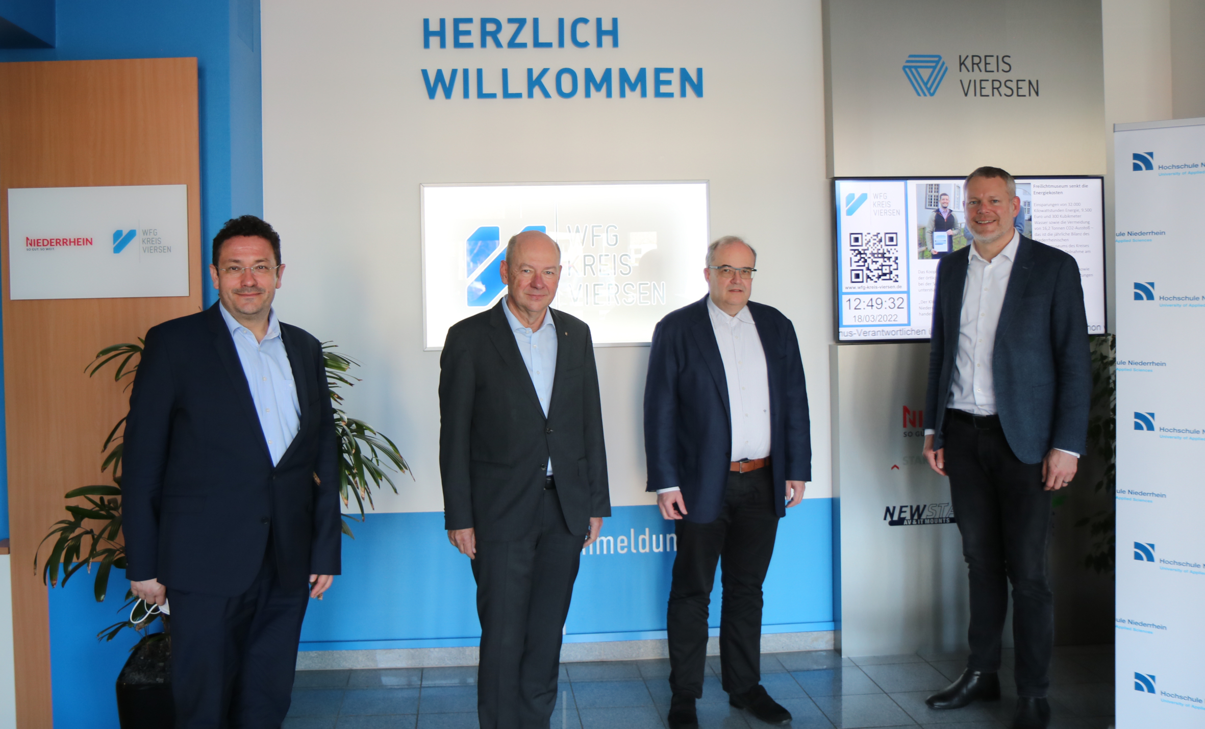 Hochschule Niederrhein eröffnet Innovations- und Zukunftsbüro in Viersen. Auf dem Bild v.l.n.r.: Dr. Joachim Schick, Dr. Thomas Grünewald (Präsident Hochschule Niederrhein), Dr. Thomas Jablonski (Geschäftsführer WFG) und Landrat Dr. Andreas Coenen.