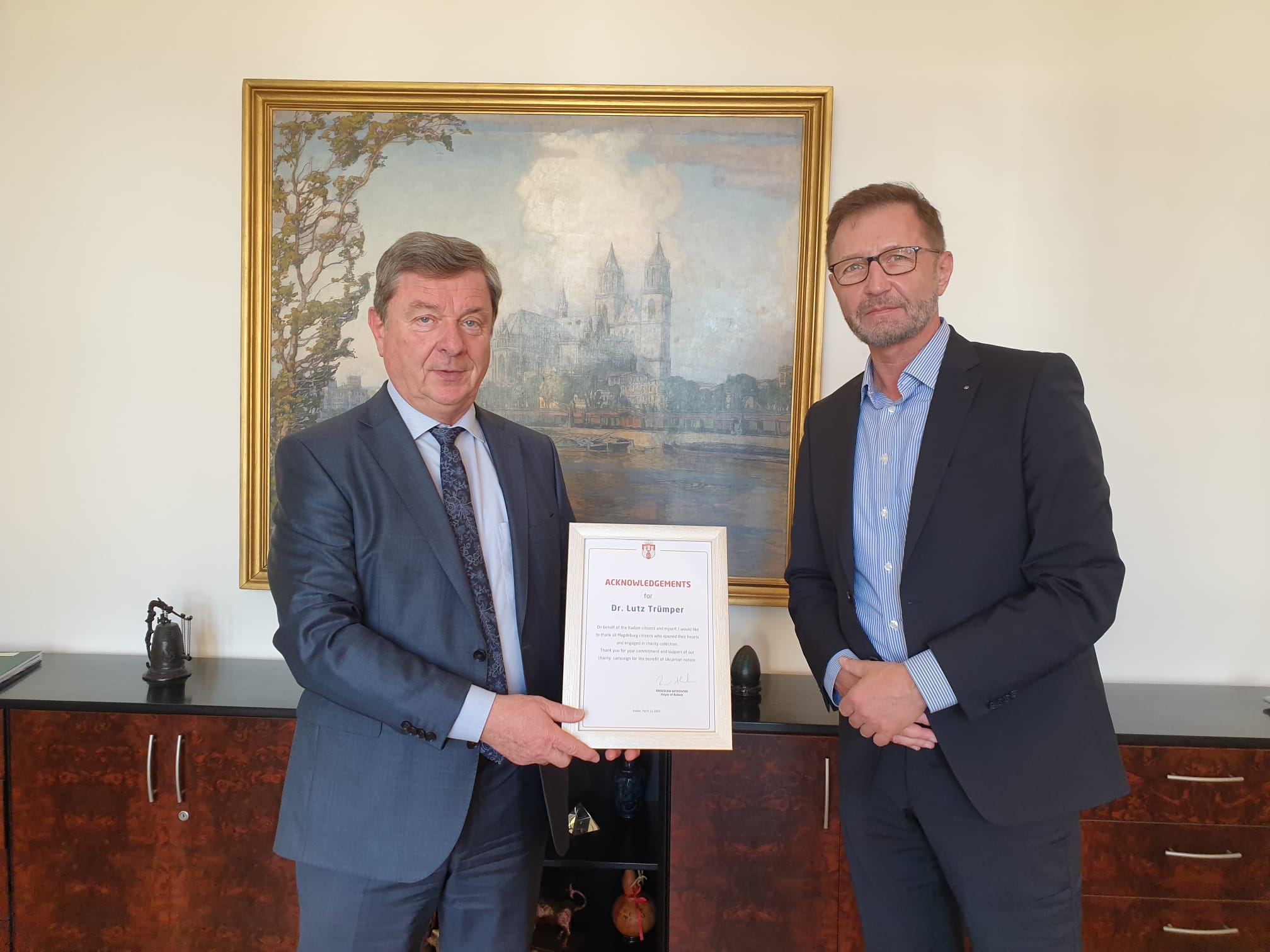 Krzysztof Blau überreicht Oberbürgermeister Dr. Lutz Trümper eine Urkunde für die humanitäre Unterstützung der Landeshauptstadt Magdeburg, die vom Radomer Bürgermeister Radosław Witkowski ausgestellt wurde.