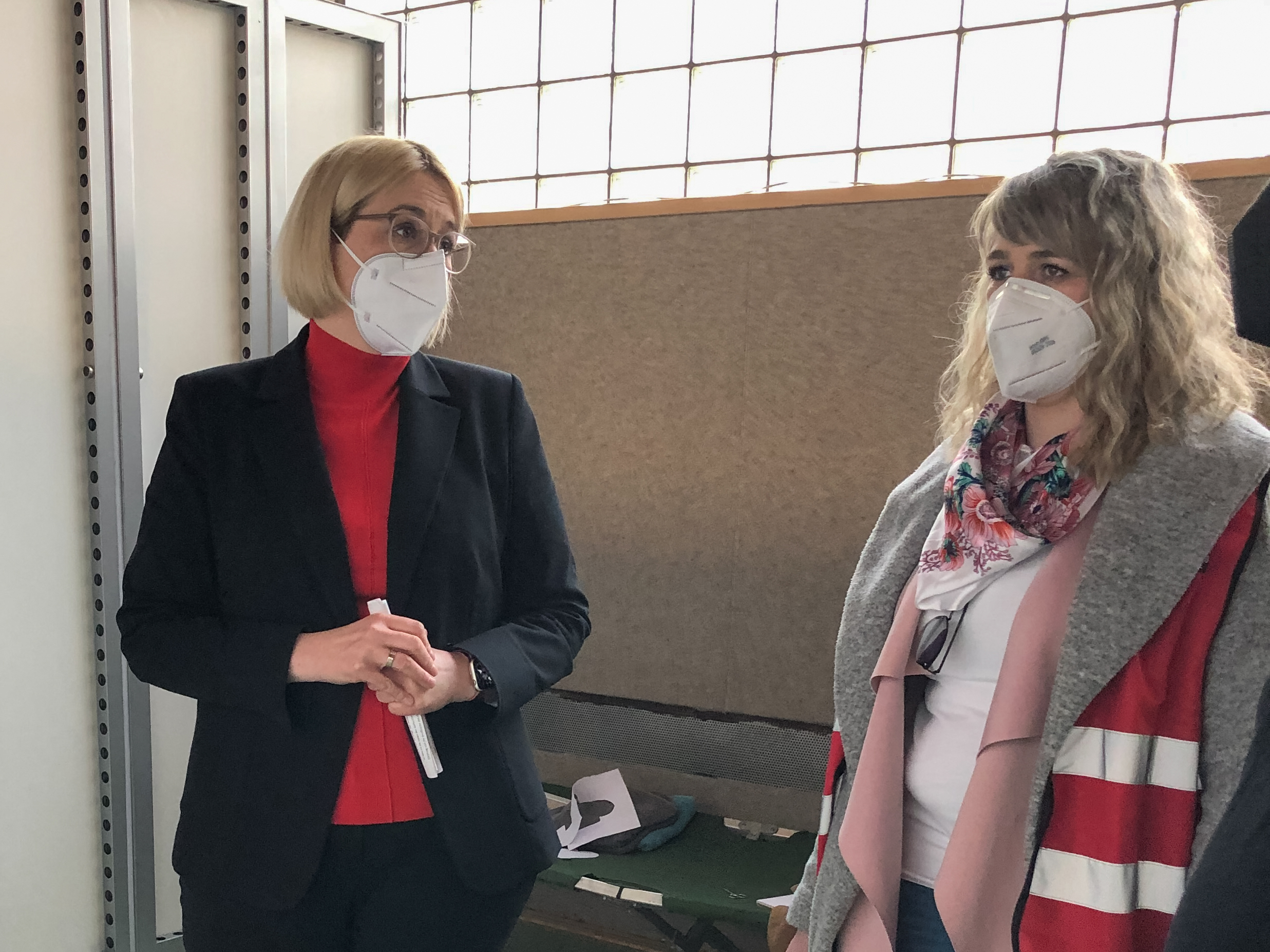 Oberbürgermeisterin Katharina Pötter (li.) und Yuliya Druker vom Fachbereich Finanzen, die zur Zeit als Übersetzerin in der Käthe-Kollwitz-Schule tätig ist.