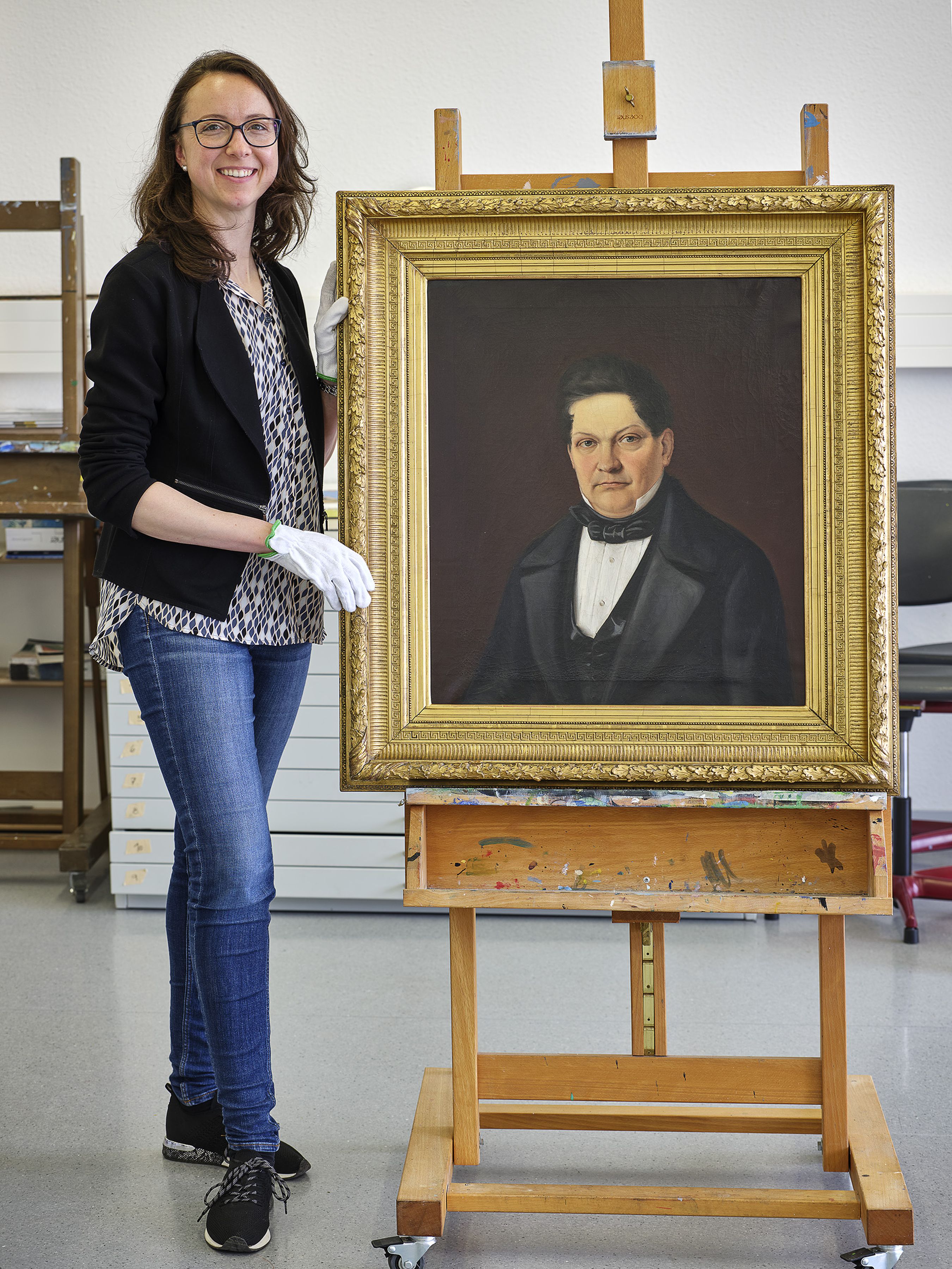 Museumsleiterin Dr. Sandra Hertel freut sich über die gelungene Restaurierung des Porträts von einem bislang unbekannten Iserlohner Bürger. Das Museum freut sich über Hinweise auf die Identität.