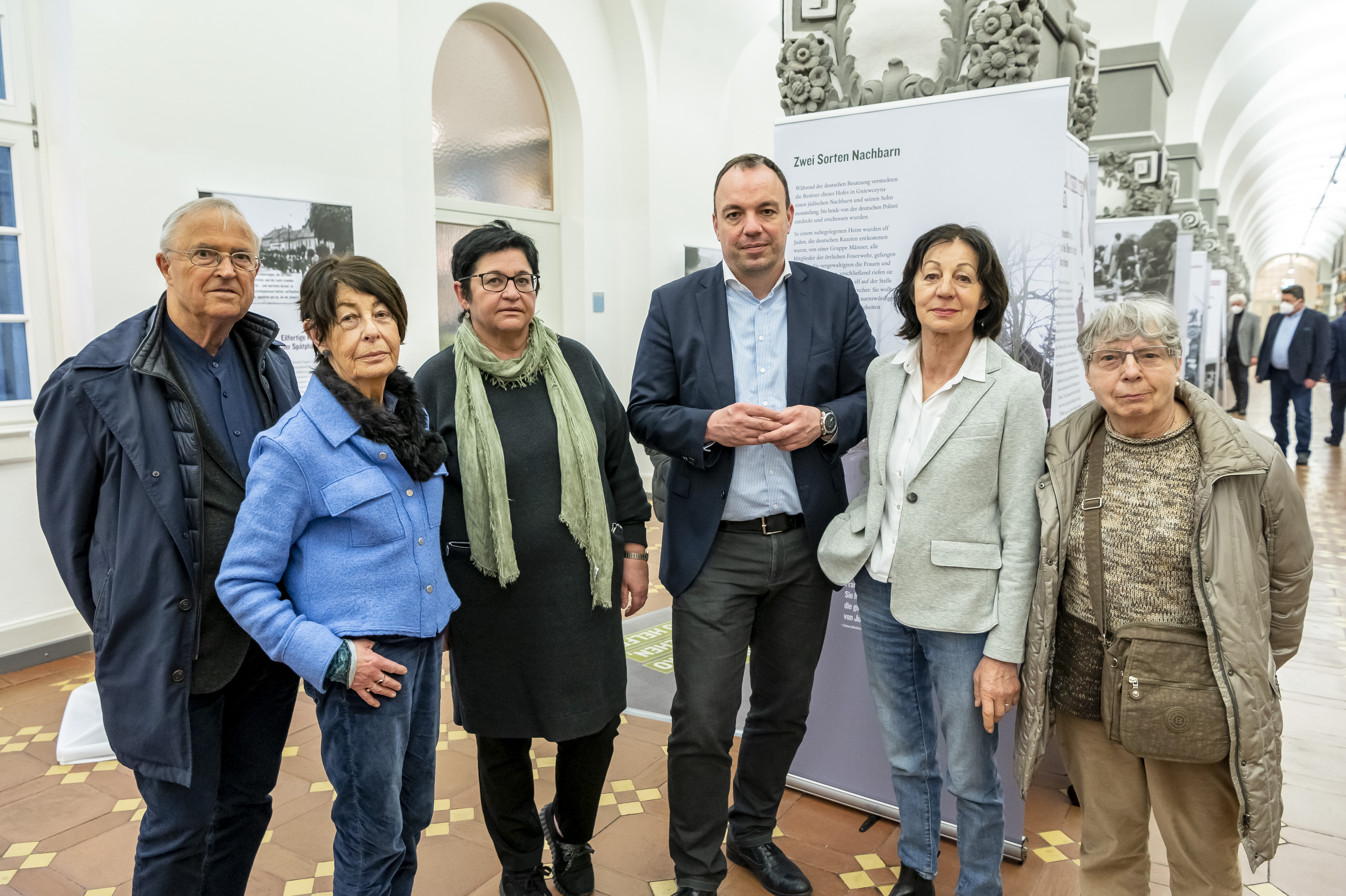 Eröffnung der Holocaust-Ausstellung des United States Holocaust Memorial Museum im Rathaus mit (von links) Ex-OB Hans Eichel, Ehrenbürgerin Dr. Eva-Maria Schulz-Jander, Ilana Katz (jüdische Gemeinde), Oberbürgermeister Christian Geselle, Stadtverordnetenvorsteherin Martina van den Hövel-Hanemann und Esther Hass (jüdische Gemeinde).