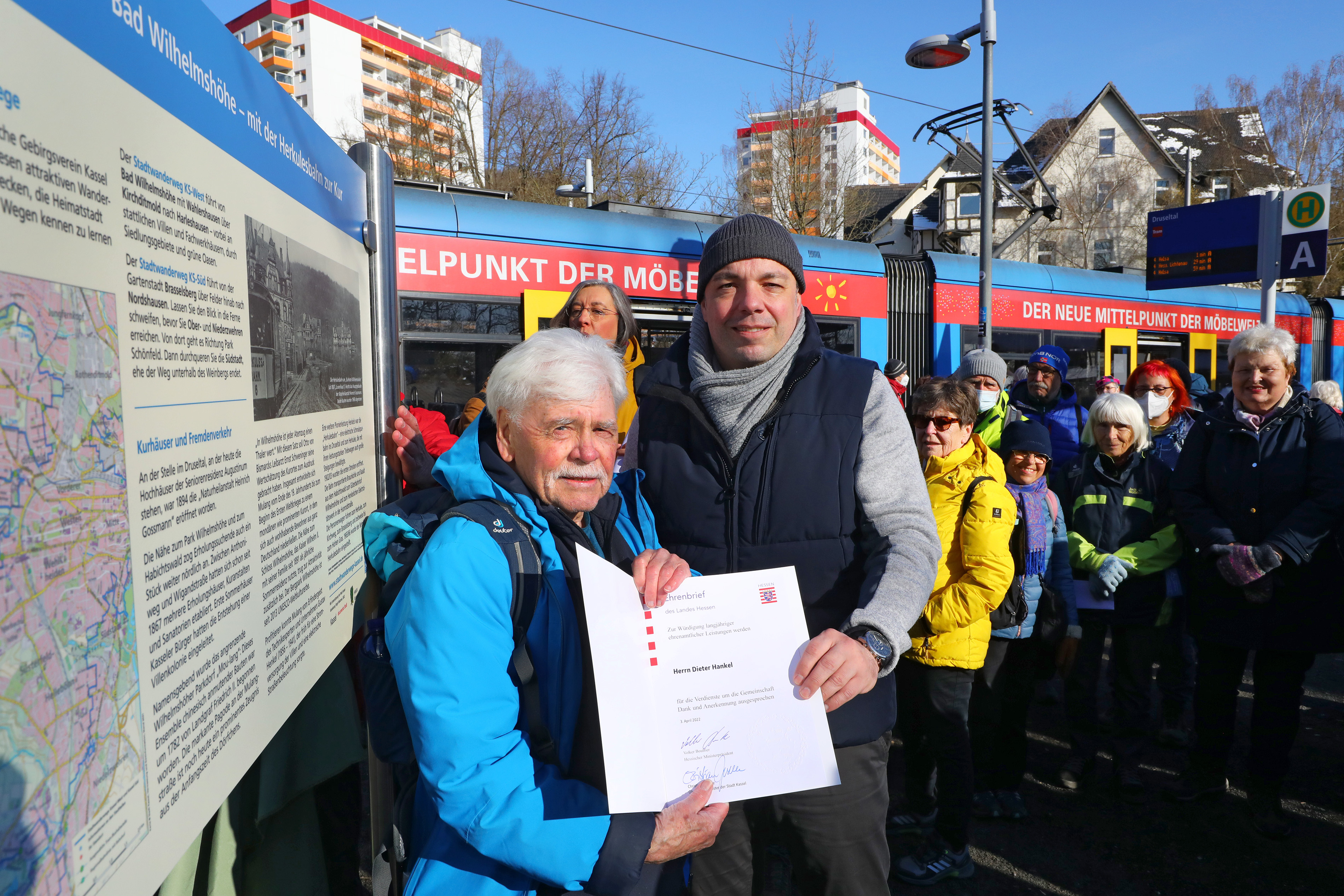 Überreichung des Ehrenbriefes an Dieter Hankel (links) durch Oberbürgermeister Christian Geselle bei der Eröffnung des neuen Stadtwanderwegs KS-West.