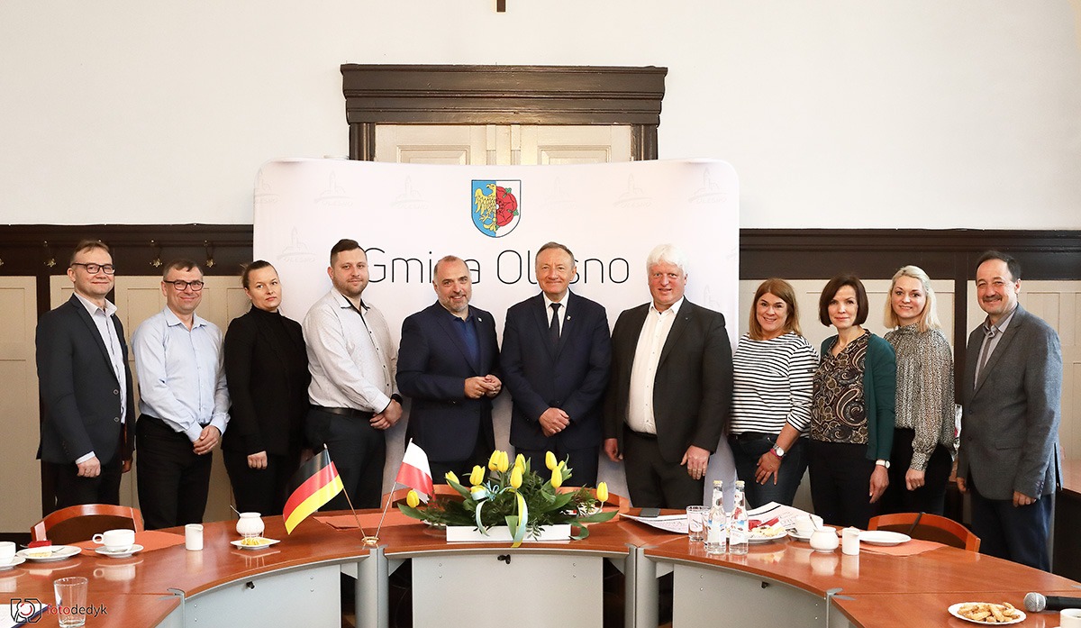 Die Arnsberger Delegation um Bürgermeister Ralf Paul Bittner (5. v. l.), Fachbereichsleiter Michael John (7. v. l.) und Kirsten Eckhardt (Bürgermeister- und Ratsbüro; 8. v. l.) beim Empfang im Rathaus von Olesno durch Bürgermeister Sylwester Lewicki (6. v. l.).