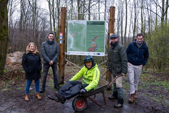 Auf die Bikes, fertig, los! Über die Freigabe der Trails freuen sich v.l.: Vivien Dieckmann (Stadtmarketing), Sebastian Matz (Abteilung Stadtentwicklung und Grundstücke), Thilo Koesling (Mountainbike Abteilung „Dead Pedals Society“), Thorsten Grote (Stadtbaurat) und Christoph Hebmüller (Mountainbike Abteilung „Dead Pedals Society“).