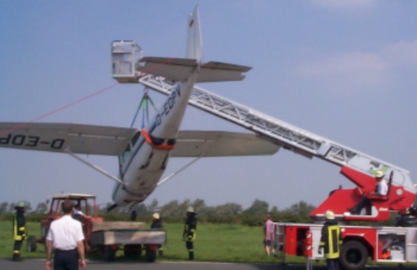 Die angehobene Maschine wird auf einem landwirtsch. Anhänger abgesetzt.