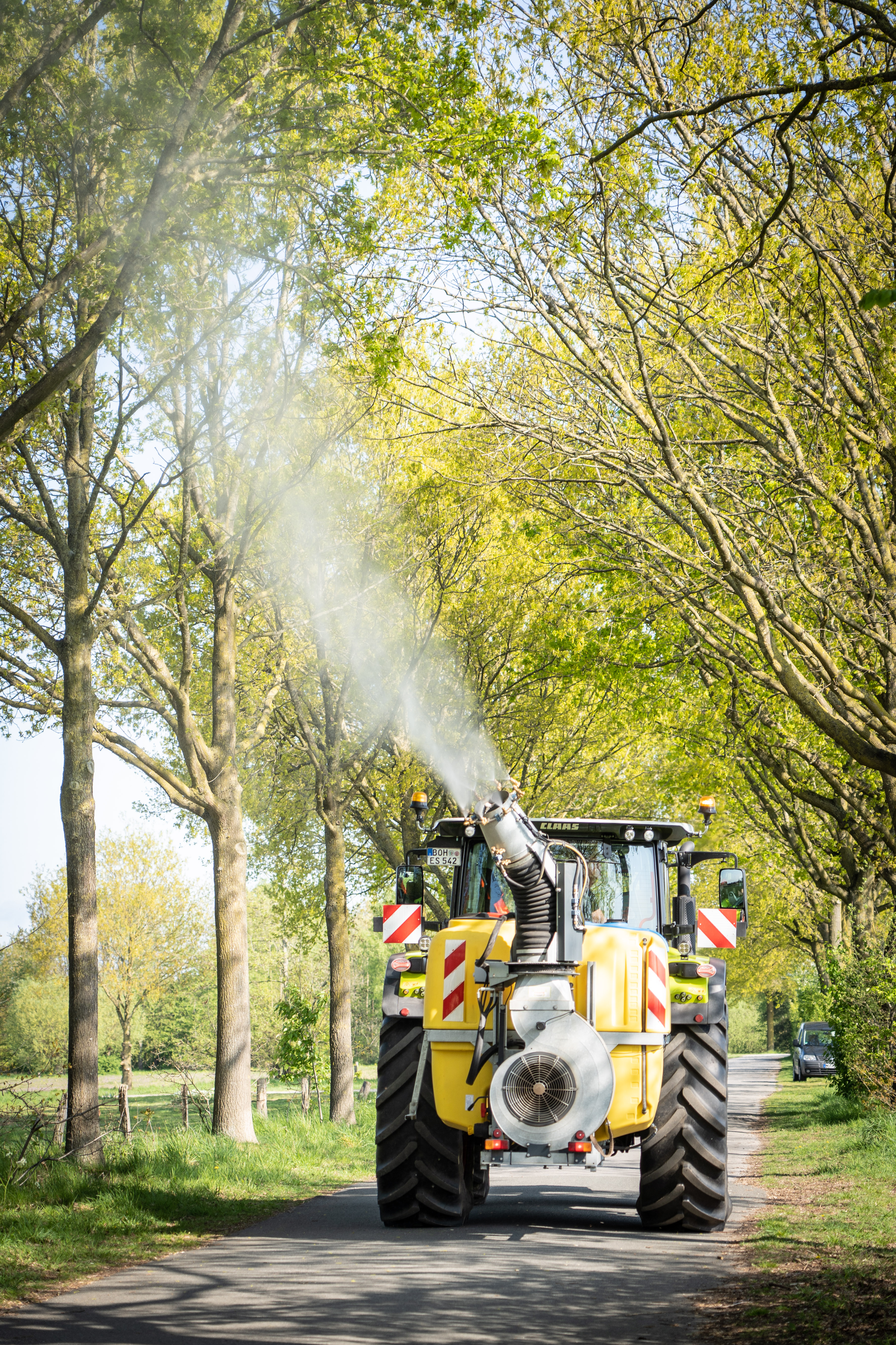 Mitarbeiterinnen und Mitarbeiter des Entsorgungs- und Servicebetriebs besprühen die Eichen in den Außenbezirken.