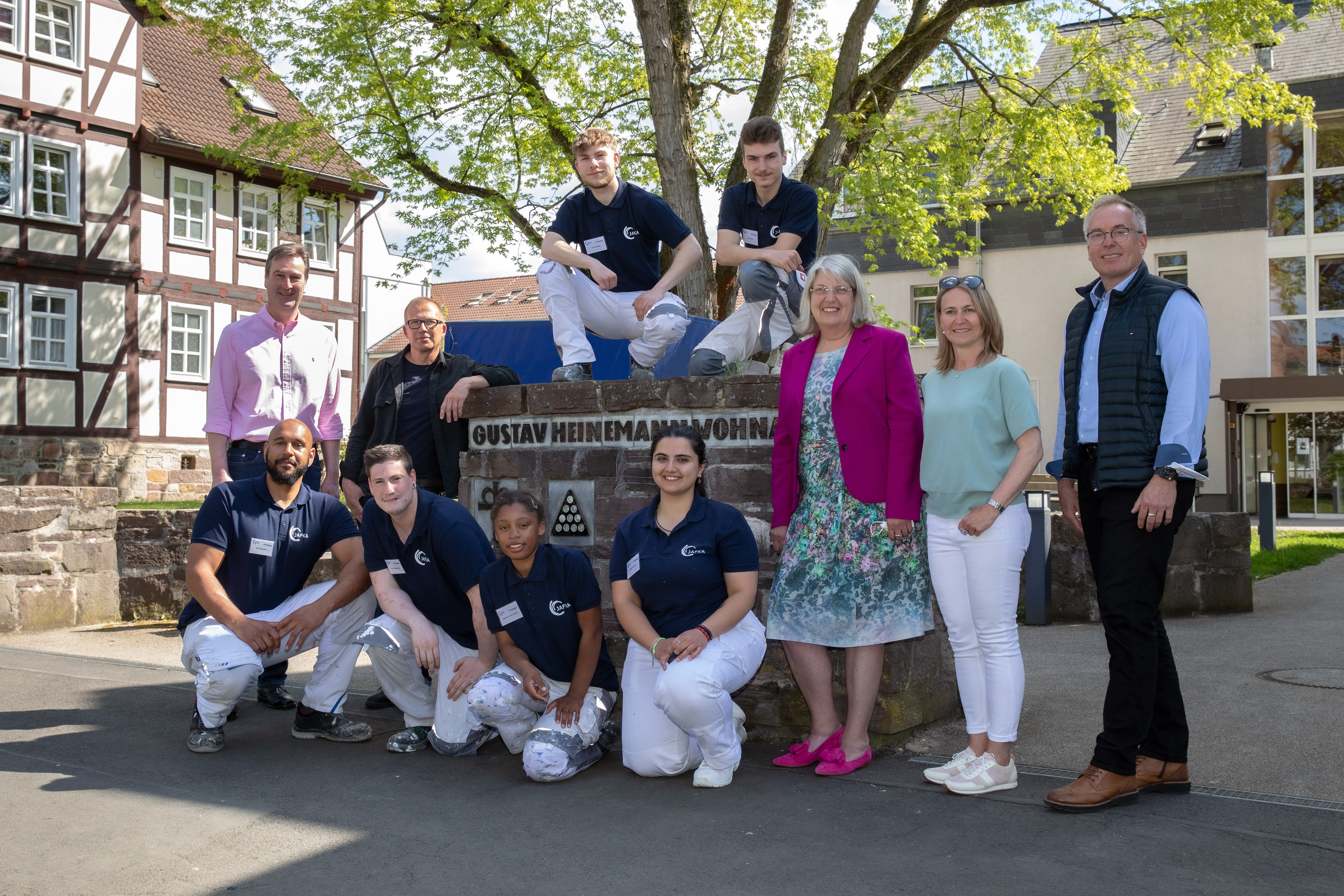 v. l.: Gerrit Jungk (Vorstand der bdks), Jan Röse (Wohnverbundleiter bdks), Auszubildende der Malerwerkstatt der JAFKA - Gemeinnützige Gesellschaft für Aus- und Fortbildung mbH inklusive Ausbilder, Ilona Friedrich (Bürgermeisterin), Anja Deiß-Fürst (Leiterin Sozialamt Stadt Kassel), Jürgen Hartrumpf (JAFKA-Geschäftsführer)