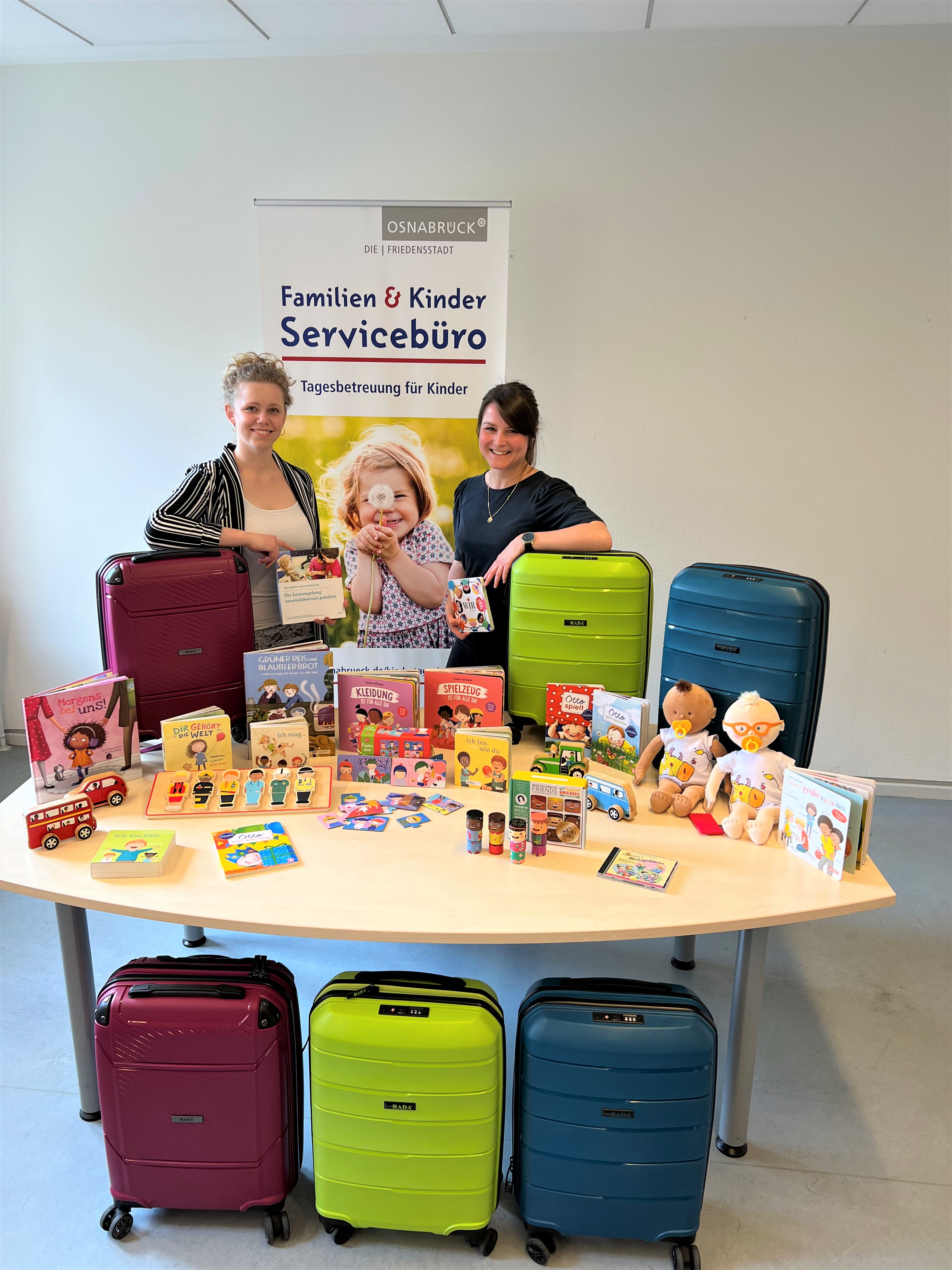 Die beiden Koordinatorinnen für das Bundesprogramm ProKindertagespflege im Familien & Kinder Servicebüro Verena Lemper und Alina Wienströer präsentieren die Inklusionskoffer.