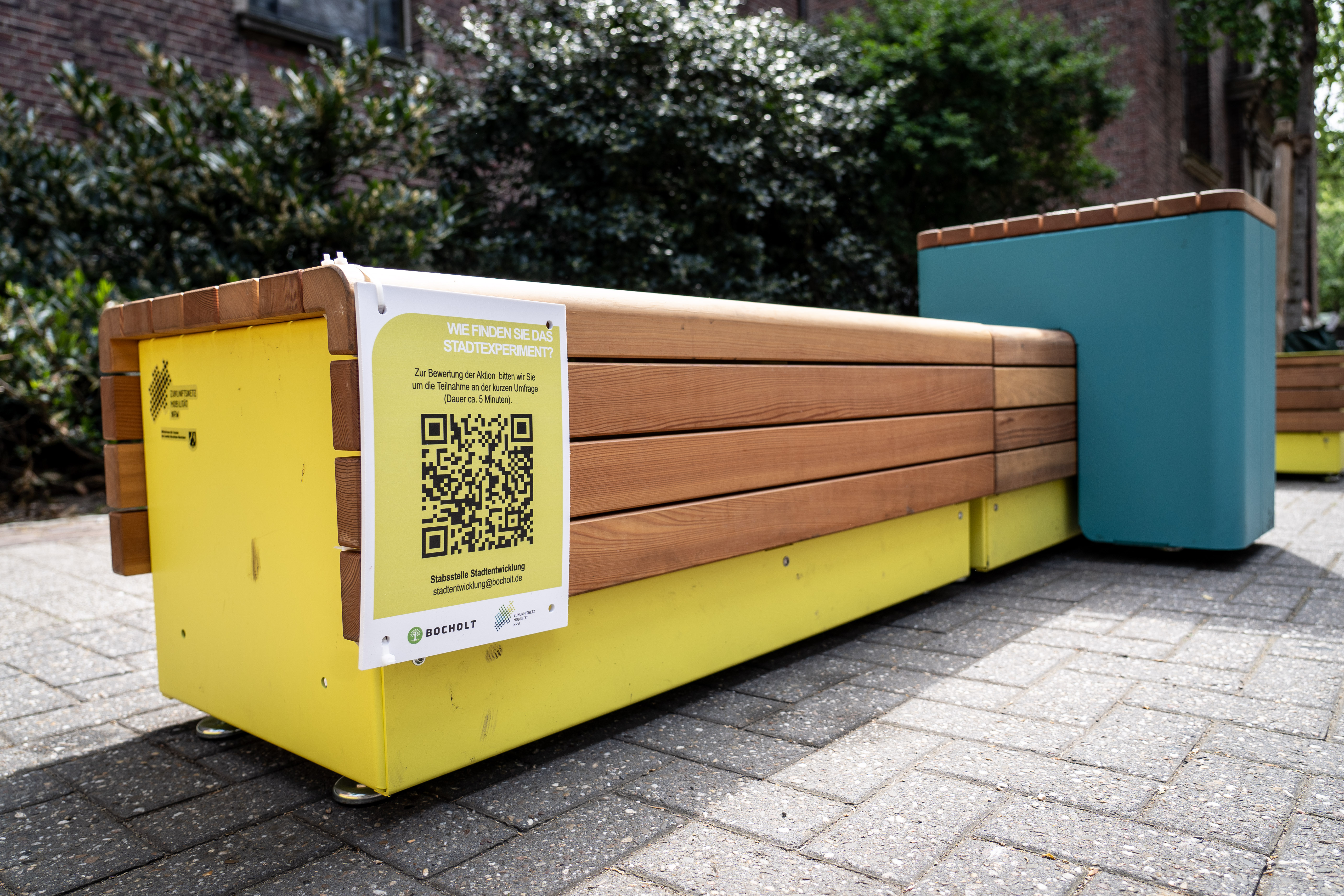Auch an der Wesemannstraße, im Schatten der Liebfrauenkirche, stehen Sitzmöbel für die Bocholter Stadtterrassen. Wer mag, kann hier eine kleine Pause machen.