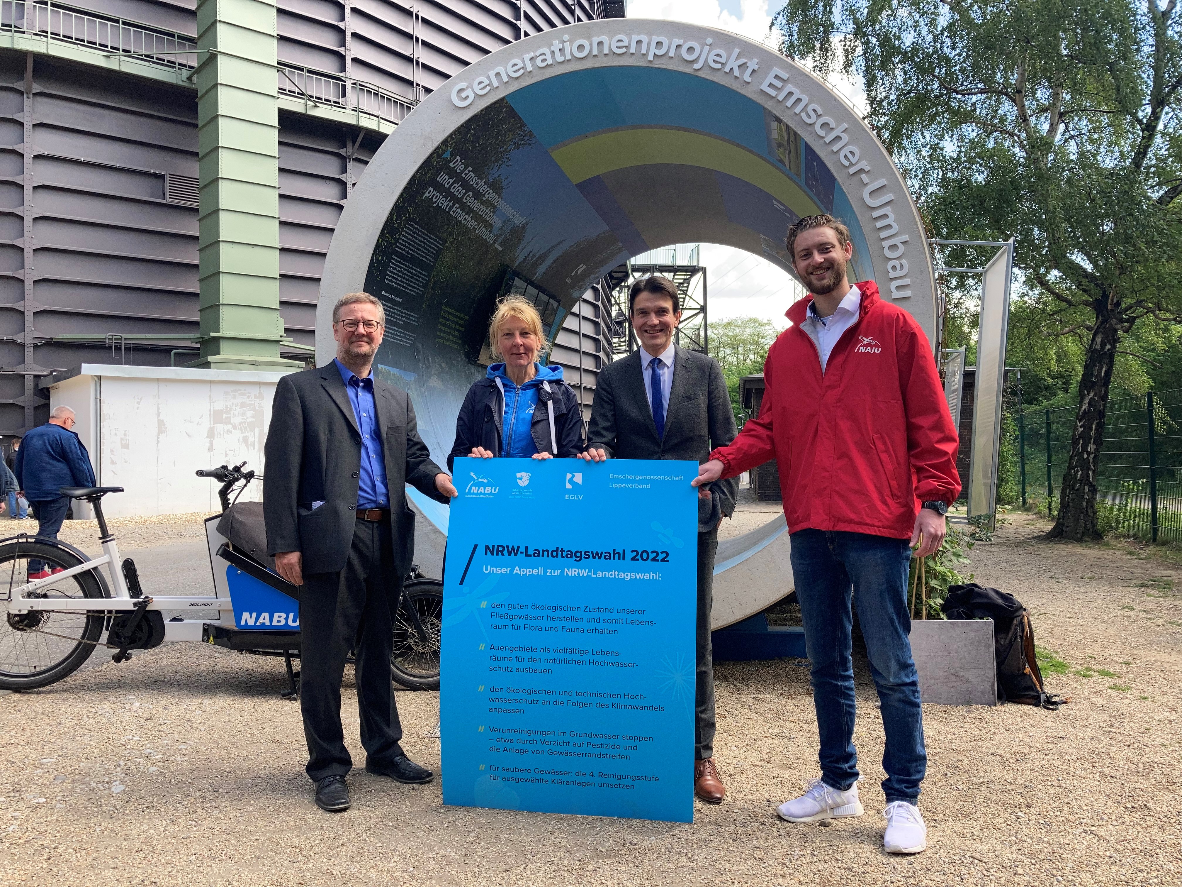 Dirk Böttger, Gasometer Oberhausen, Dr. Heide Naderer, NABU NRW, Prof. Dr. Uli Paetzel, Vorstandsvorsitzender von Emschergenossenschaft und Lippeverband und Lukas Stemper, NAJU NRW (von links nach rechts), stellen die gemeinsamen Forderungen zur Landtagswahl in NRW vor.