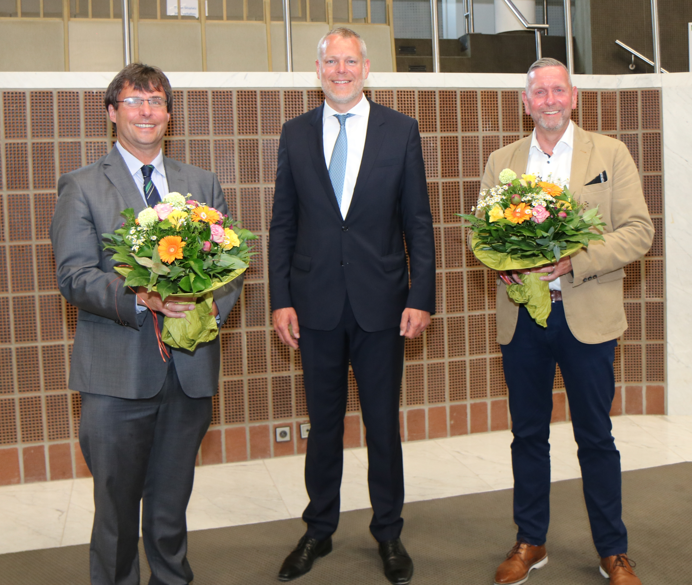 Im Kreishaus gratuliert Landrat Dr. Andreas Coenen den Direktkandidaten Dr. Marcus Optendrenk (CDU, Wahlkreis Viersen II) und Guido Görtz (CDU, Wahlkreis Viersen I).