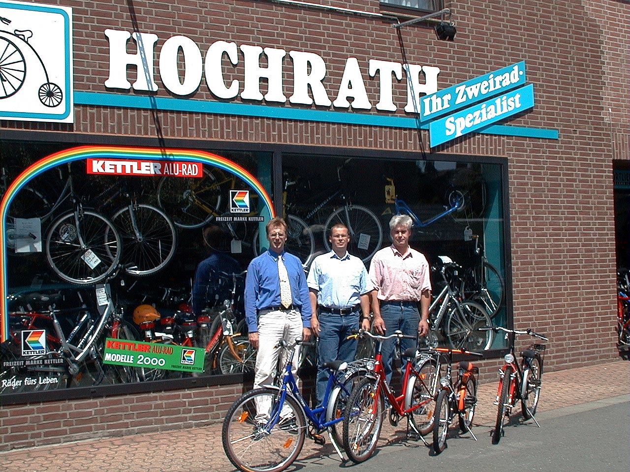 Stellen die vier Hauptpreise des Verkehrssicherheitsquiz für Grundschüler vor: v.l.n.r. Bruno Wansing, Presse- und Informationsamt, Ludger Thesing, Amt für Öffentliche Ordnung (beide vom Organisationsteam Verkehrssicherheit) und Fahrradhändler Franz-Josef Hochrath, der die Fahrräder zur Verfügung stellt.