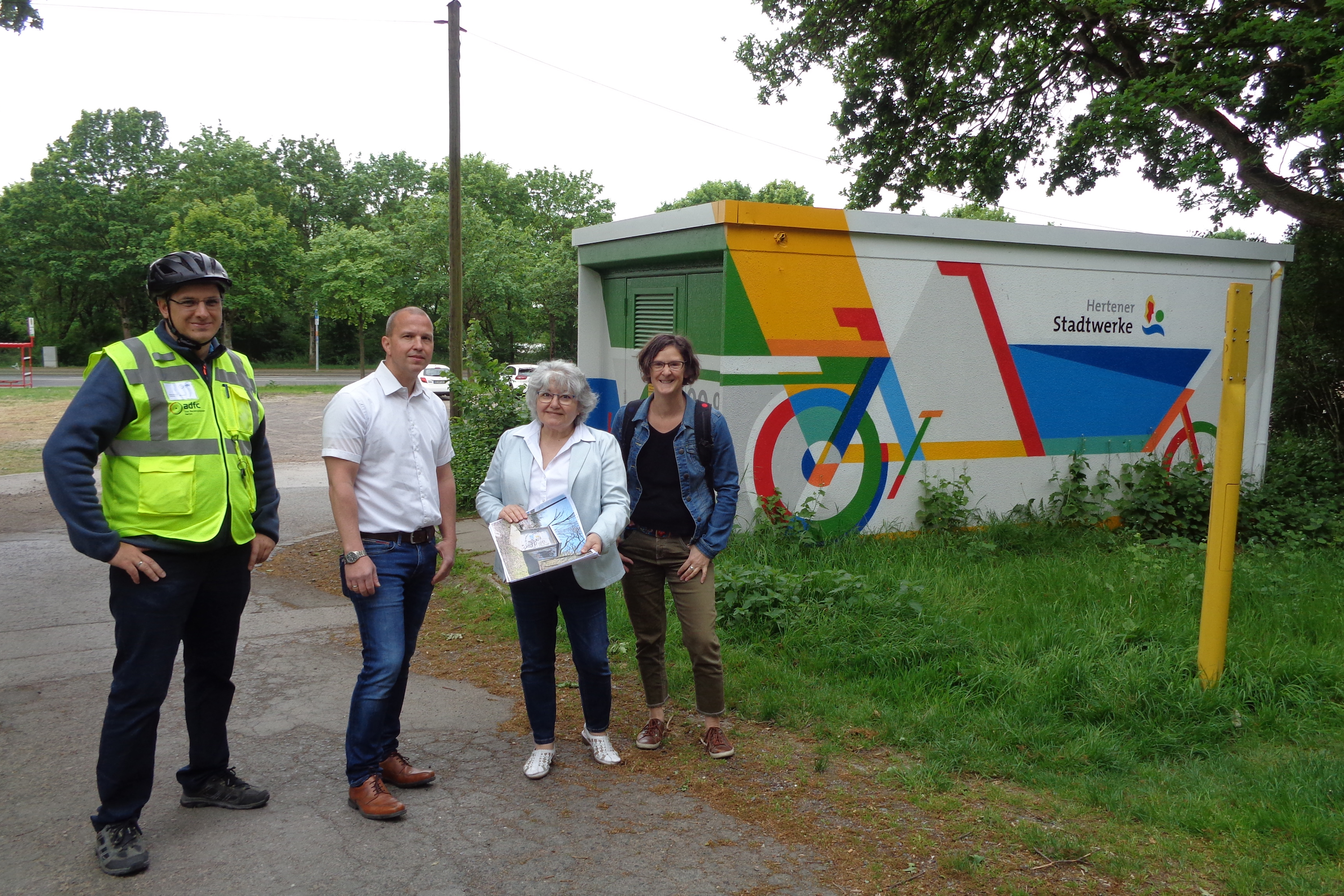 (v.l.n.r.) Patrick Berner vom ADFC Herten, Marco Netz von den Hertener Stadtwerken, Stadtbaurätin Janine Feldmann und Anja Thomas, Leiterin des Stadtplanungsamtes, freuen sich über die kreative Gestaltung.