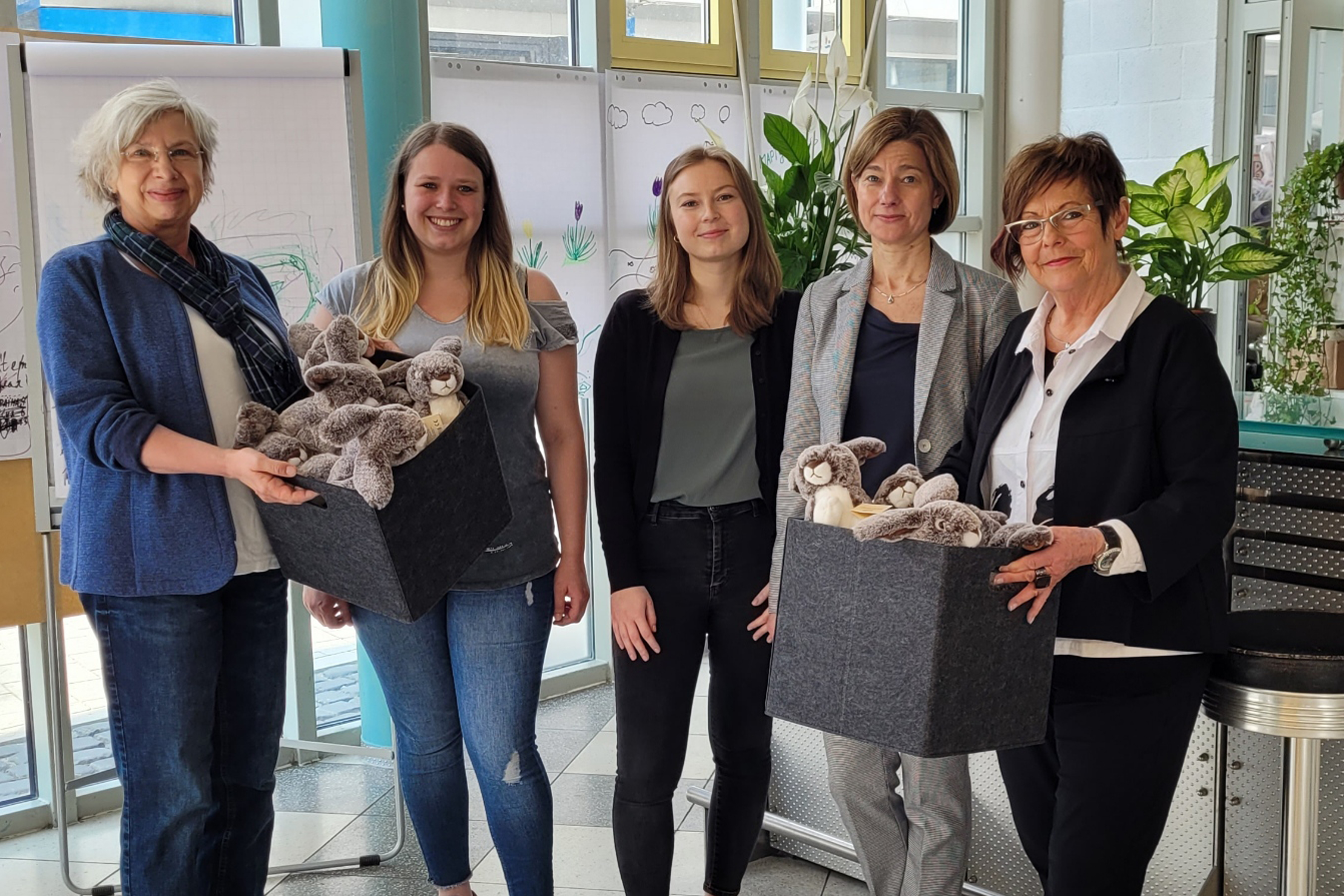 Eva-Maria Siuda (Innenstadtbüro), Julia Rosenkranz (Frauenhaus Herten), Sandra Weglinski (Anlaufstelle Ukraine), Uschi Dorka (Stadt Herten) und Monika Karkowski (Monja Moden) freuen sich darüber, dass „Hasi“ in Kinderhände kommt. (Foto: Jessica Zubala)