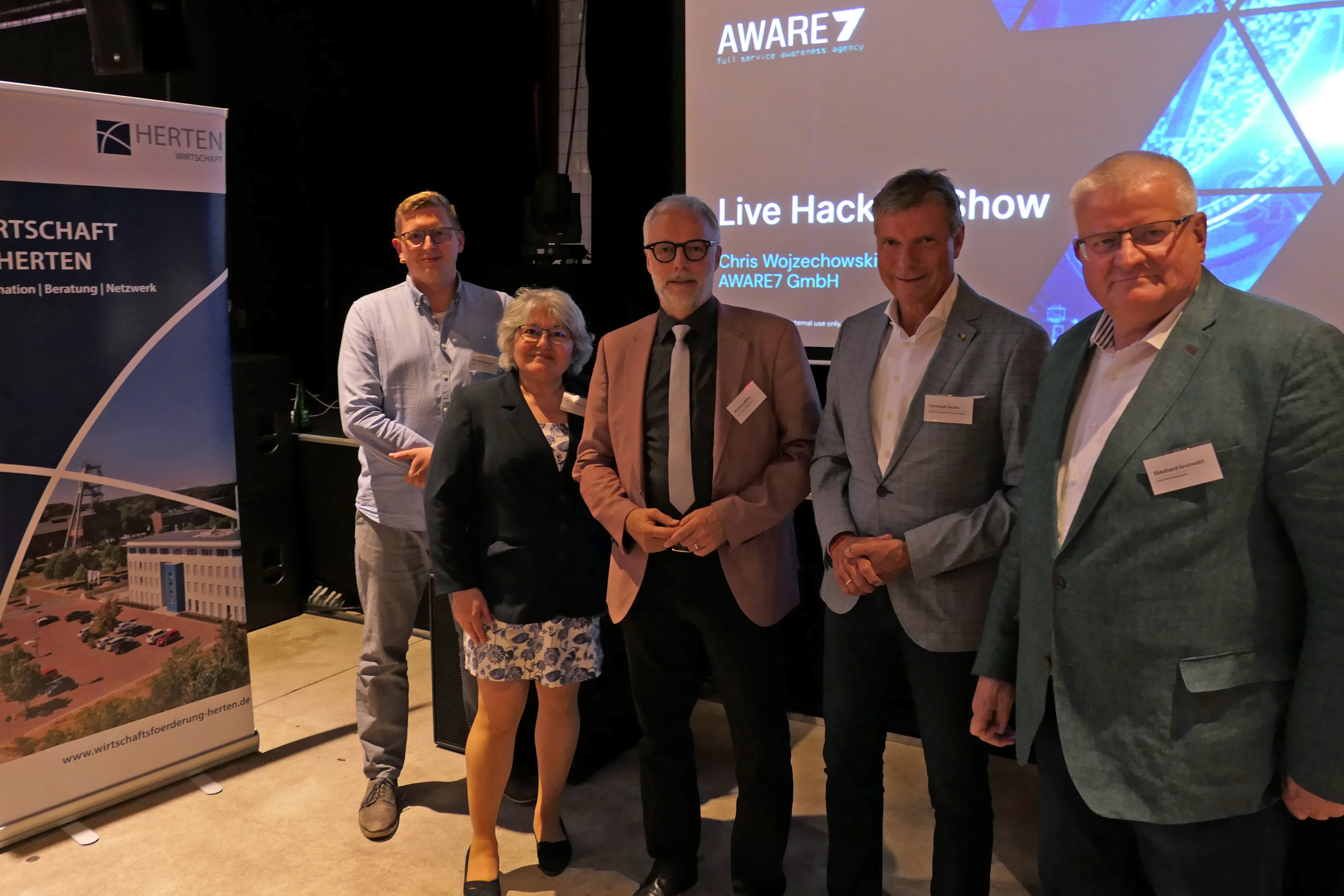 Referent Chris Wojzechowski von der Aware 7 GmbH, Hertener Stadtbaurätin Janine Feldmann, Bürgermeister Matthias Müller sowie Bürgermeister Christoph Tesche aus Recklinghausen und sein erster Beigeordneter Ekkehard Grunwald nahmen am interkommunalen Unternehmertreffen in der Hertener Schwarzkaue teil.