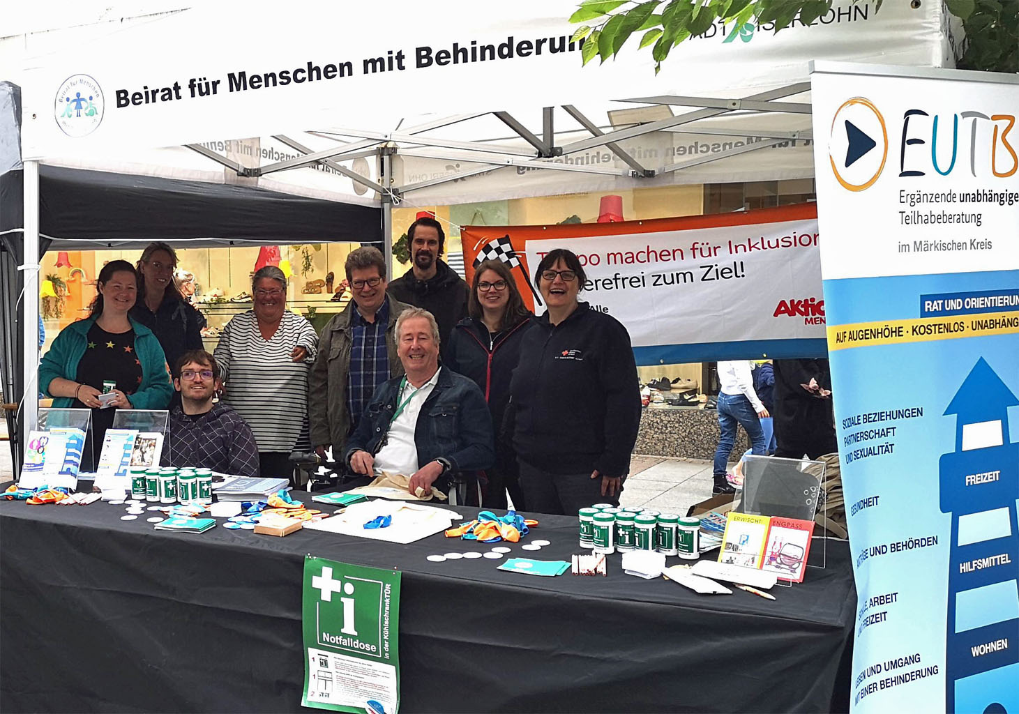 Freuten sich über zahlreiche Besucher ihres Infostandes (v.r.): Renate Kopetz (Beirat), Jessica Späing und Torbjörn Köpp (EUTB), Peter Martin (Beirat), Petra Starke, Mechthild Starke-Kersting (Beirat), Gilbert Krüger (Gemeinschaftsdienst), Nina Schulte (FuD), Denise Sahm (Gemeinschaftsdienst).