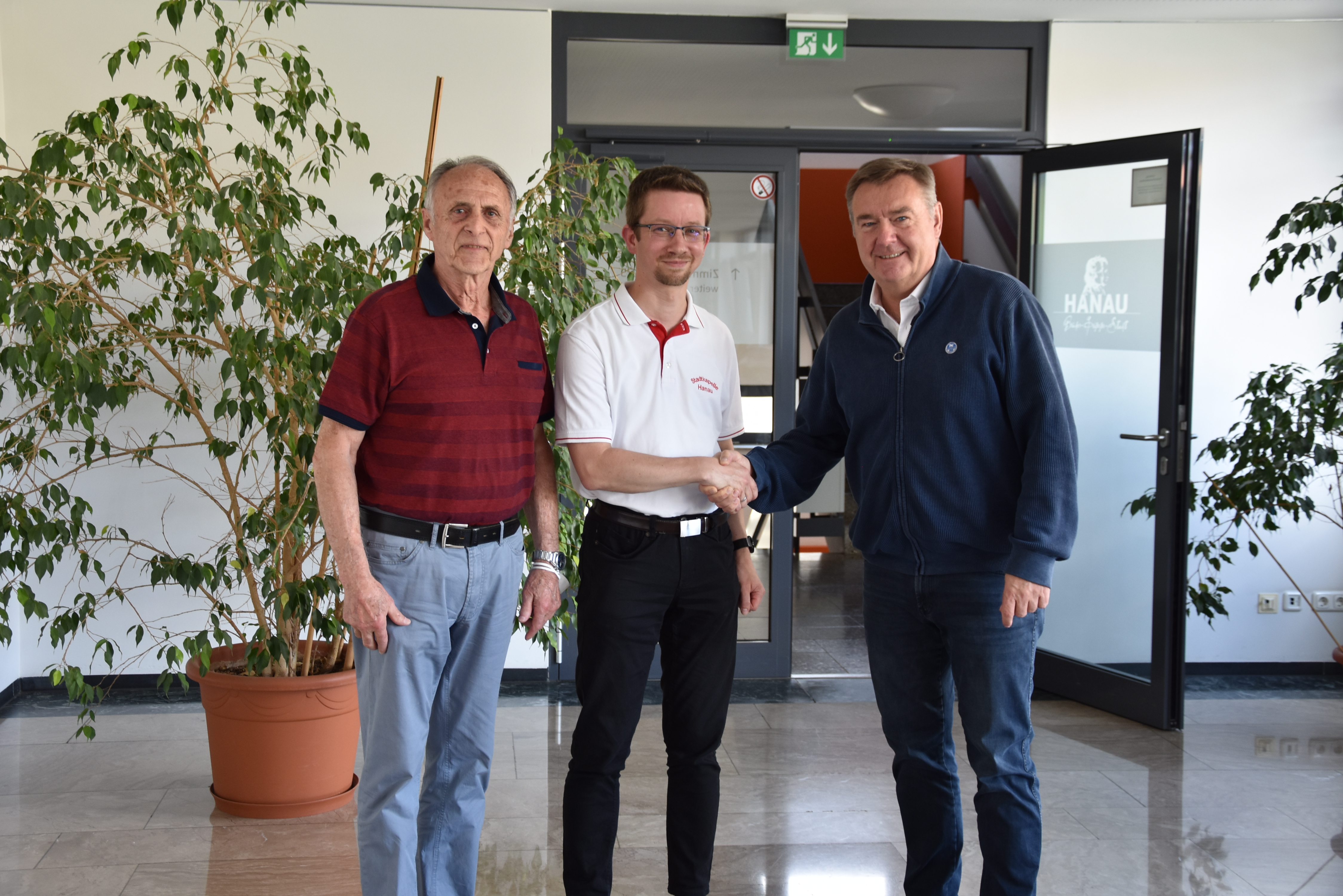 Saxofonist Helmut See und Johannes Nüßlein, erster Vorsitzender der Hanauer Stadtkapelle, besuchten Oberbürgermeister Claus Kaminsky (von links). Dabei stellten sie ihr neues Vereinskonzept vor.