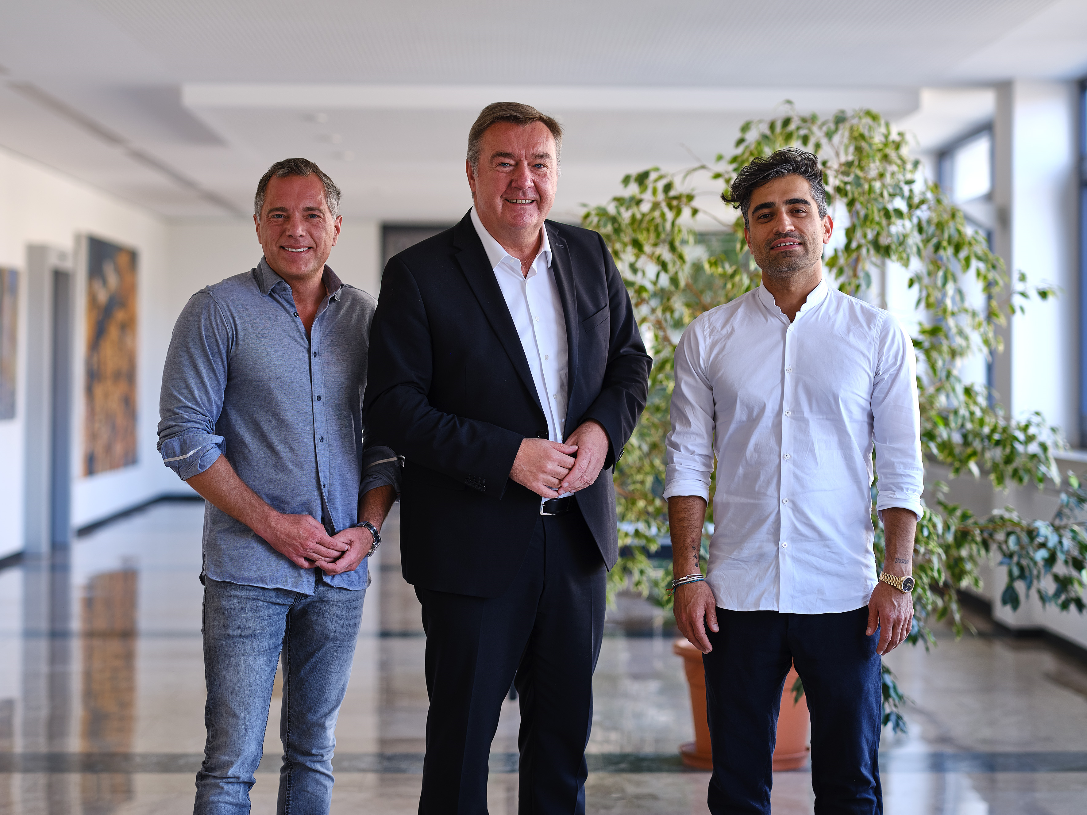 Auf dem Bild sind v.l.n.r. Moritz Breitenbach (Geschäftsführender Gesellschafter German Medical GmbH), Oberbürgermeister der Stadt Hanau Claus Kaminsky und Rocky K. Musleh (Geschäftsführender Gesellschafter German Medical GmbH).