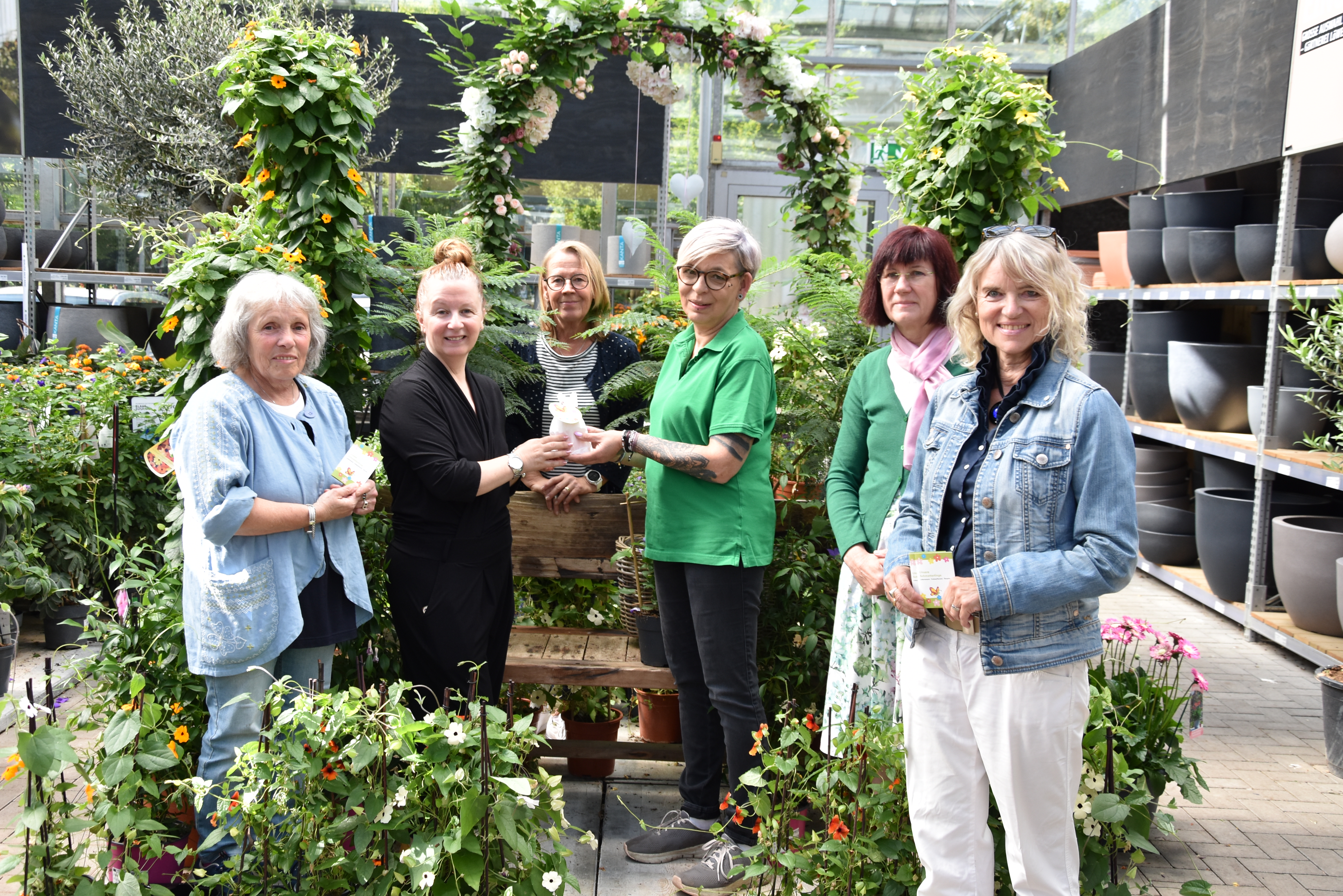 Bei der Spendenübergabe anwesend: Birgit Schröder, Mitarbeiterin des Umweltzentrums Hanau, Tafel-Leiterinnen Gordana Herzberger-Kapetanic und Annette Geier-Neugebauer, Petra Müller, Marktleitung der Gärtnerei Löwer in Hanau, Jutta Knisatschek, Geschäftsführender Vorstand der Stiftung LICHTBLICK sowie Gabriele Schaar-von Römer, Leiterin des Umweltzentrums (von links).