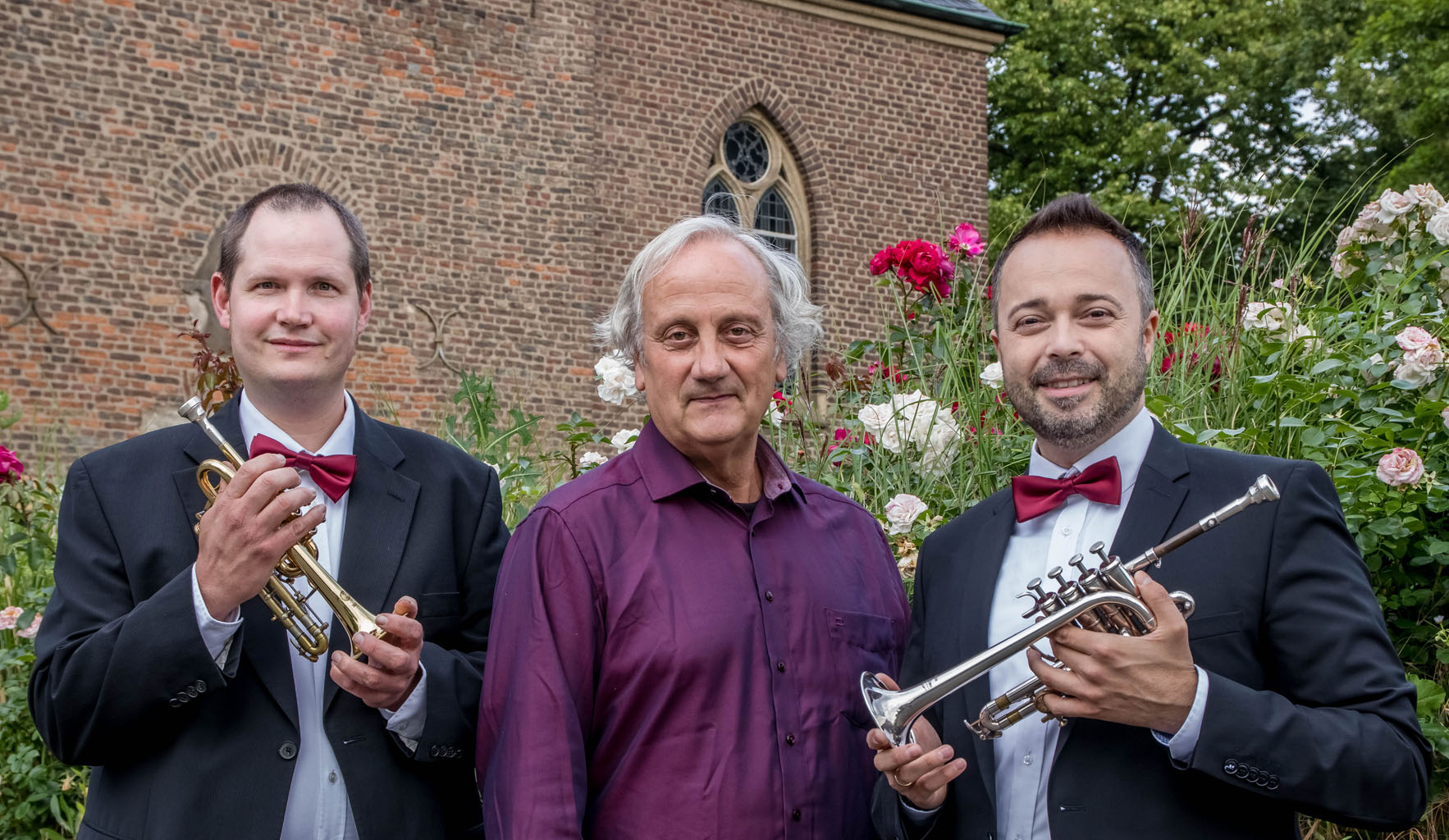 Musizieren beim 5. Iserlohner Kammerkonzert am Sonntag in Iserlohn: Martin Schröder (Trompete), Flavius Petrescu (Trompete), Hans-André Stamm (Orgel)