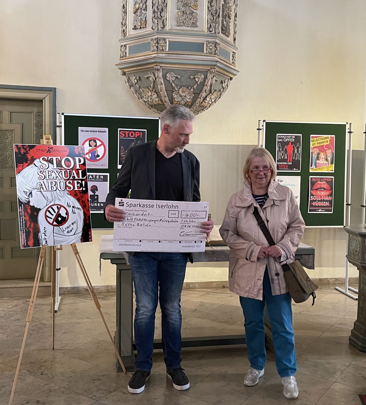 Jörg Simon, bei der Stadt Iserlohn zuständig für präventiven Jugendschutz, überreicht Marlis Gorki, Mitglied des Partnerschaftskomitees, stellvertretend den symbolischen Scheck über 400 Euro Preisgeld.
