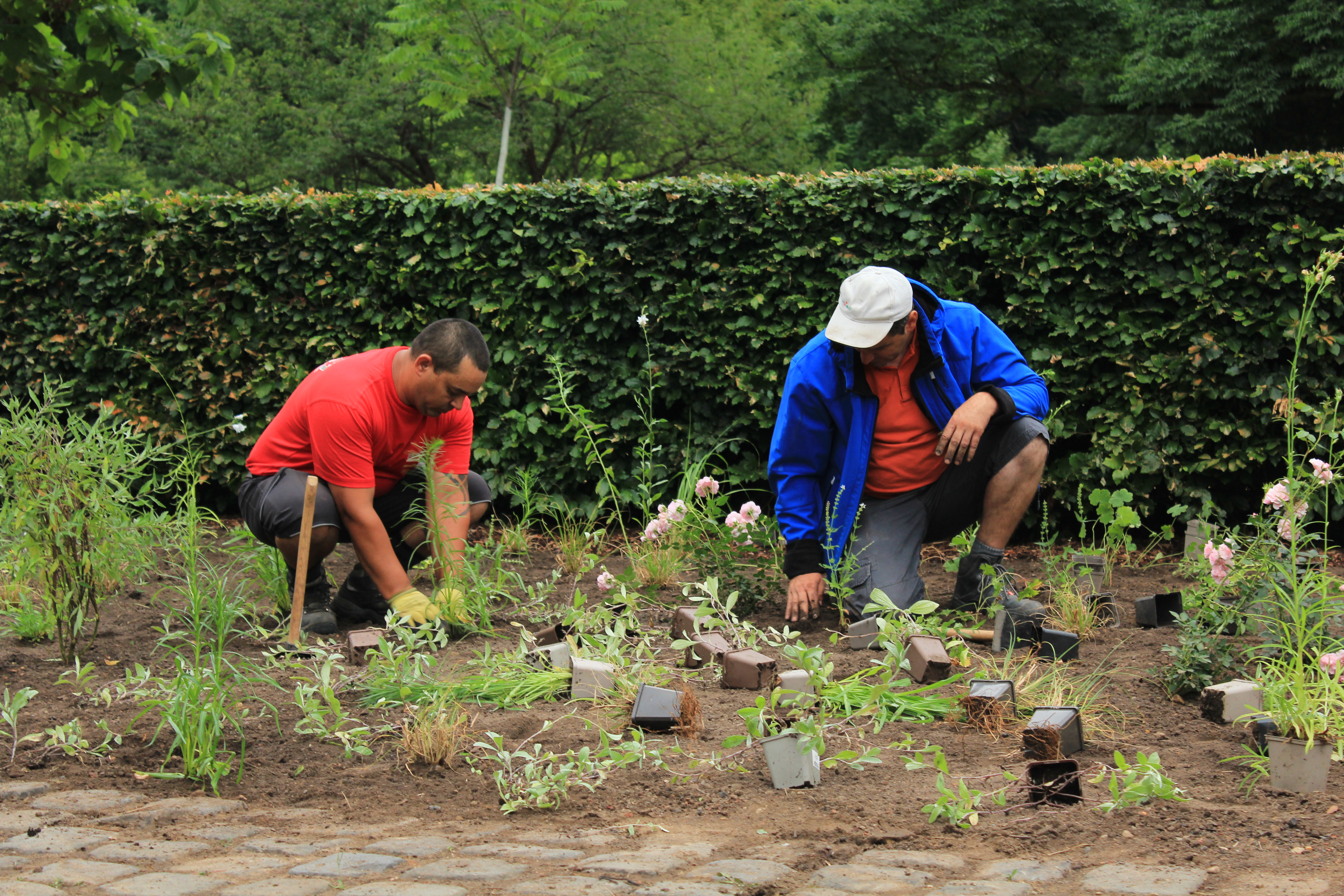 Während der Arbeiten im Rosengarten werden im ersten Schritt die alten Pflanzbereiche abgetragen. Anschließend werden Stauden, Rosen und Gräser gepflanzt.