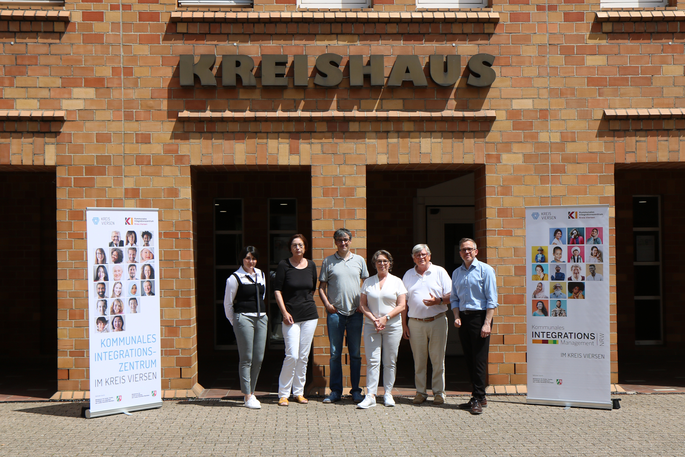 v.r.n.l.: Sozialdezernent des Kreises Viersen Jens Ernesti, Hans Josef Kampe (CDU), Mathilde Holtmanns, Leiterin Kommunales Integrationszentrum (KI), Sozial- und Pflegeplanung, Manuel Garcìa Limia (SPD), Maria Dittrich (Grüne) und Felicia Bot-Jurca (KI)