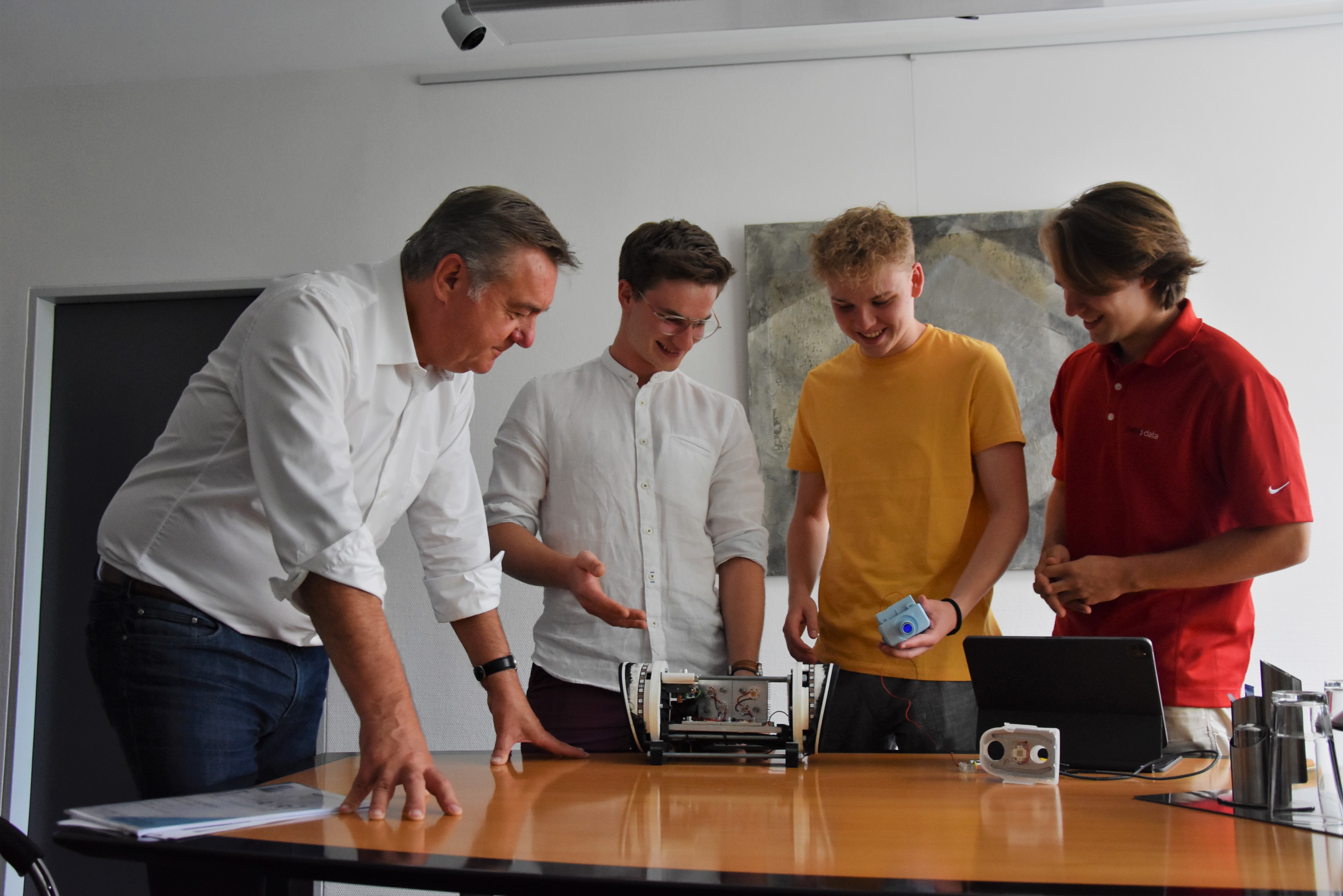 Im Gespräch mit Oberbürgermeister Claus Kaminsky erklärten Maximilian Pfannkuch, Dominik Hein und Jaro Filip (von links) die Funktionsweise ihres Forschungsprojekts sowie dessen Weiterentwicklung.
