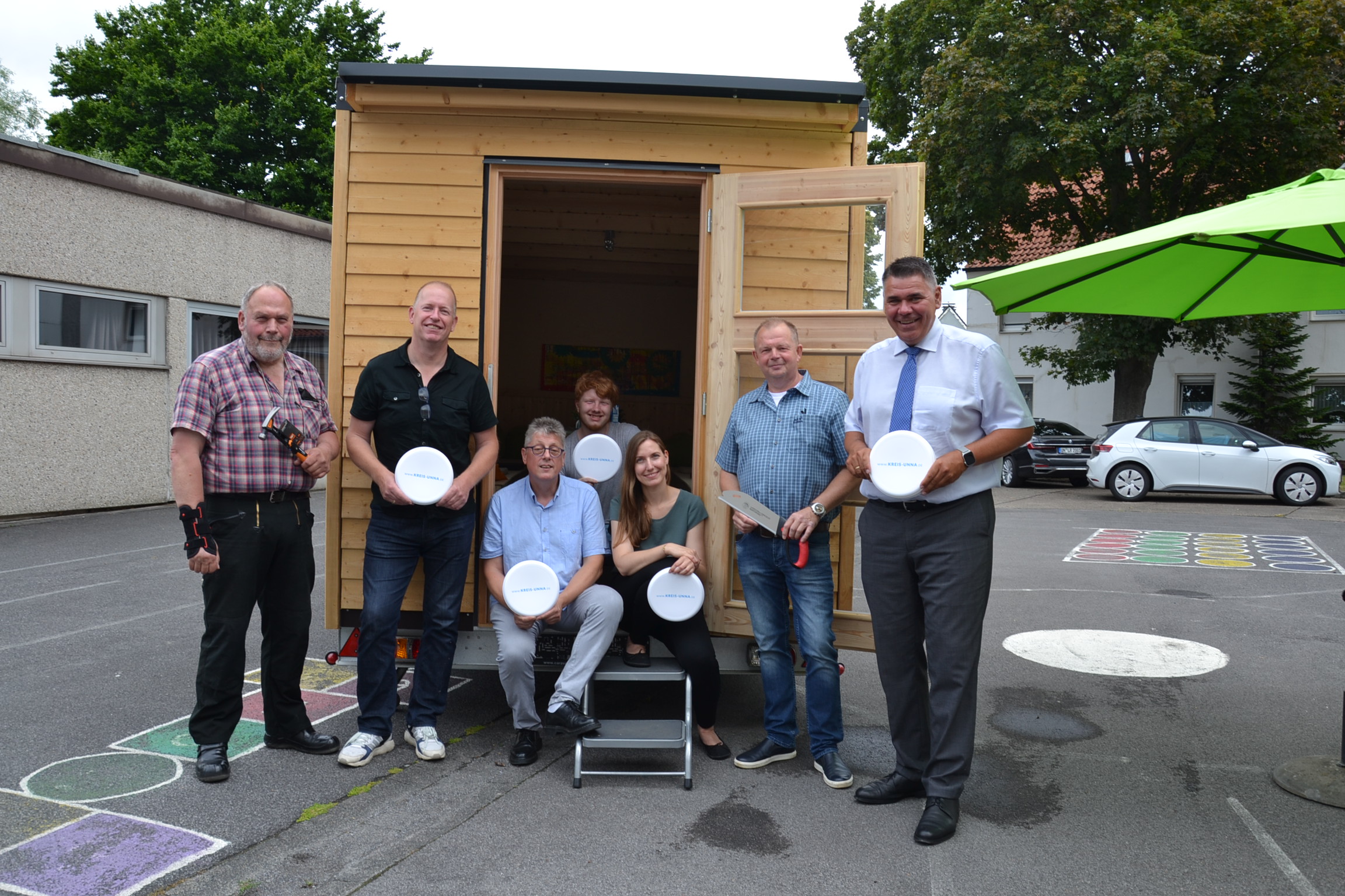 Zimmermeister Dieter Ladwig, Bürgermeister Stephan Rotering, Sachgebietsleiter Jugendarbeit Klaus Faß, GoIn-Stammgast Marius Obser, GoIn-Leiterin Angela Bräuer, Caravan-Händler Thorsten Vogelsang und Landrat Mario Löhr vor dem Wagen. Foto: Max Rolke – Kreis Unna