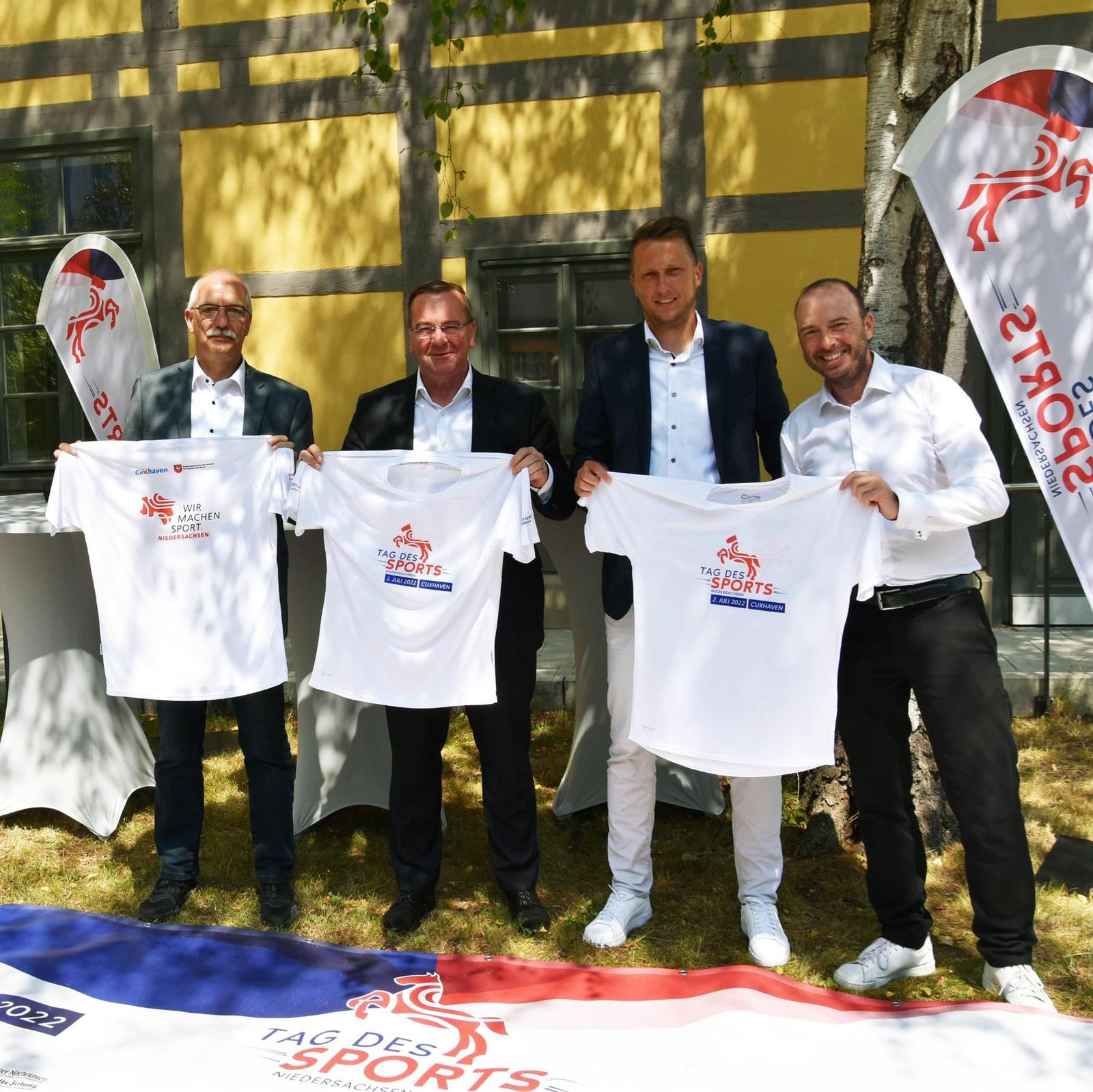 Der Tag des Sports Niedersachsen findet am 2. Juli 2022 in Cuxhaven statt: Niedersachsens Innenminister Boris Pistorius (2.v.l.) hat gemeinsam mit den Partnern von Radio ffn, dem Kreissportbund Cuxhaven, dem Landessportbund Niedersachsen und der Ausrichterstadt Cuxhaven, vertreten durch Pressesprecher Marcel Kolbenstetter (2.v.r.), am Montag in Hannover noch einmal kräftig die Werbetrommel gerührt. Foto: Nds. Ministerium für Inneres und Sport