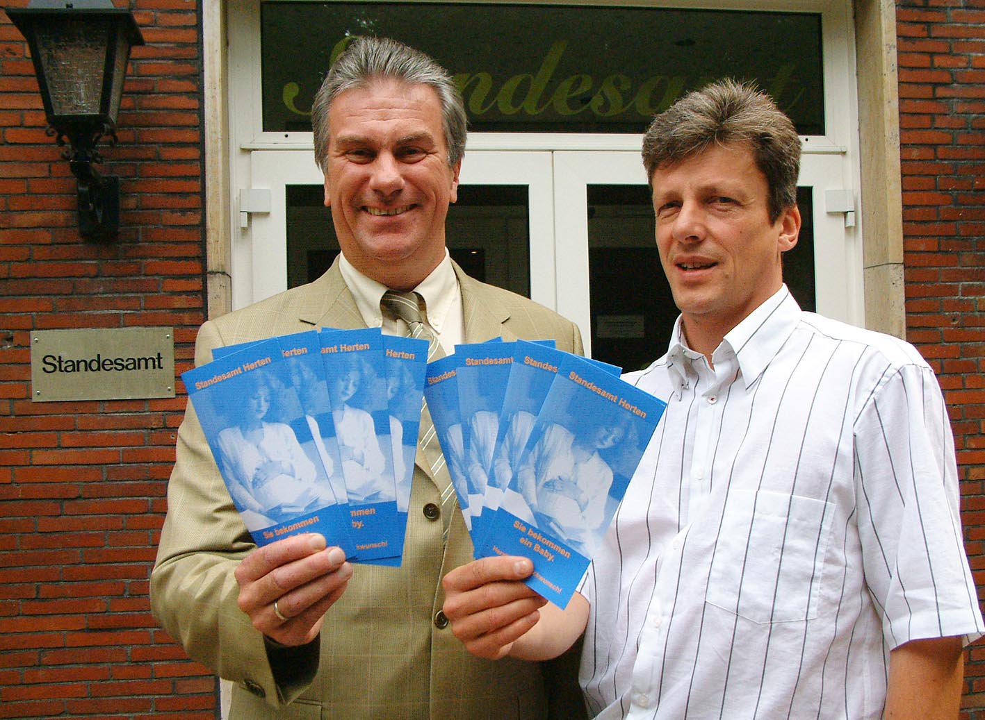 Rainer Paesler (li.) und Rainer Berkau stellten am Mittwoch im Standesamt der Stadt Herten das neue Faltblatt "Sie bekommen ein Baby" vor.