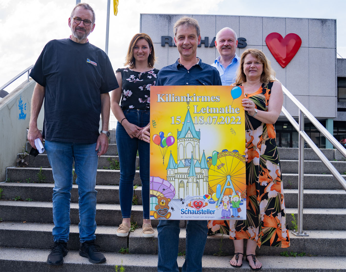 Laden alle Kirmesfans herzlich ein zur Kiliankirmes 2022 (v.l.): Paul Nowak (Werbegemeinschaft Letmathe) sowie von der Stadt Iserlohn OSD-Teamleiterin Laura Kickermann, Kirmesorganisator Thomas Johannsen, Ressortleiter Christian Eichhorn und Ordnungsamtsleiterin Angela Schunke.