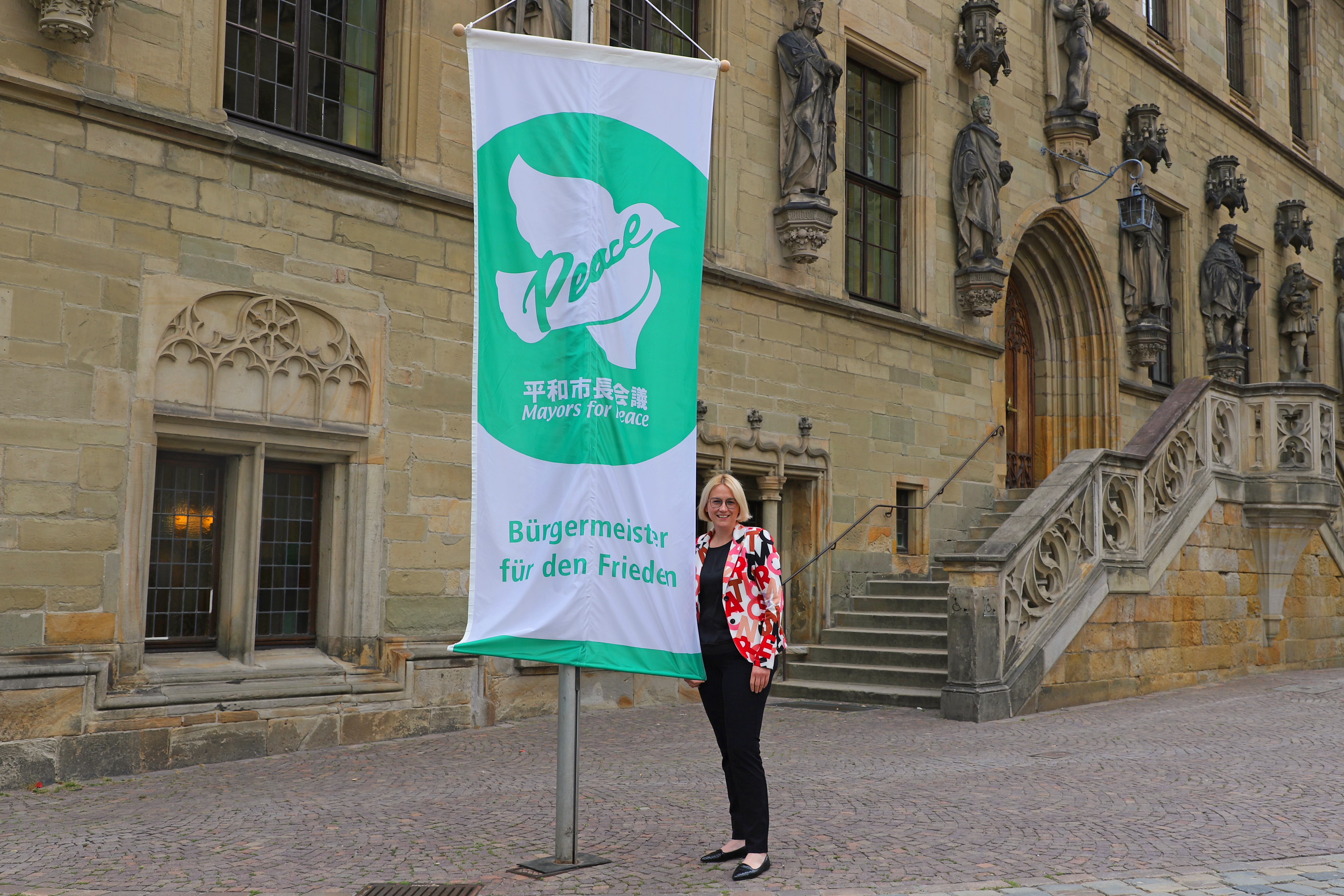 Oberbürgermeisterin Katharina Pötter präsentiert vor dem Osnabrücker Rathaus die Flagge von Mayors for Peace.